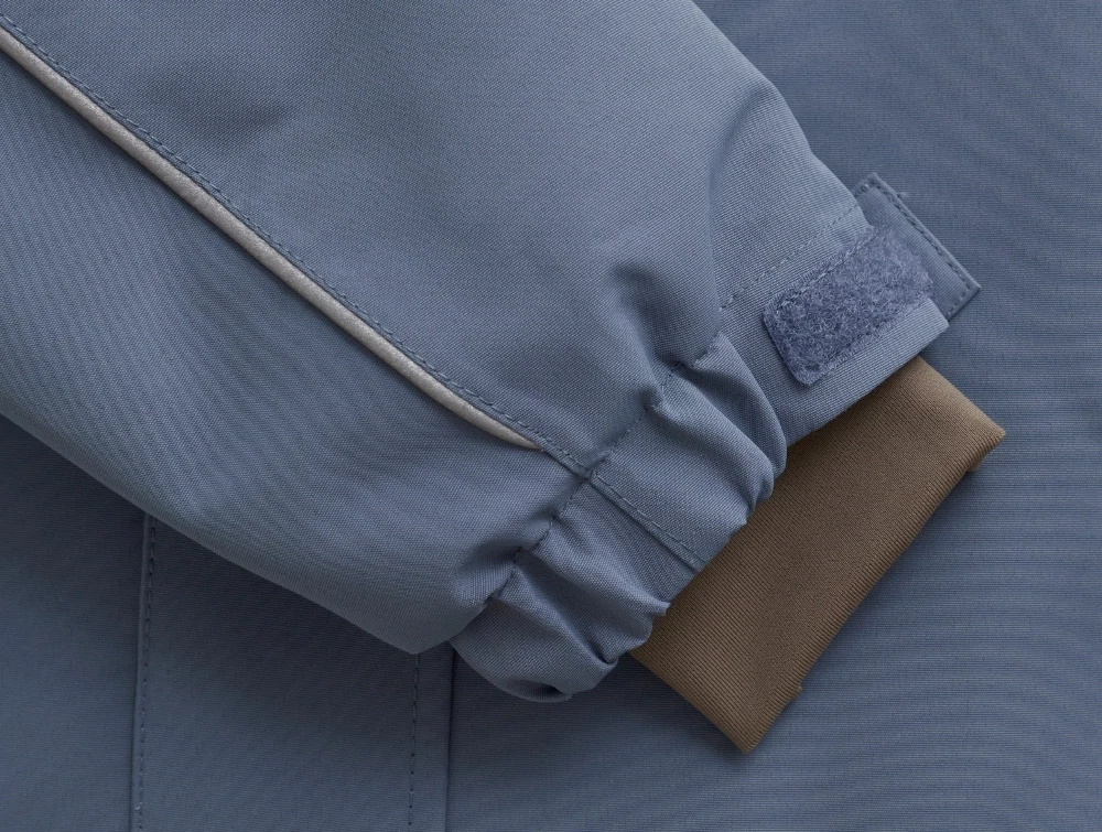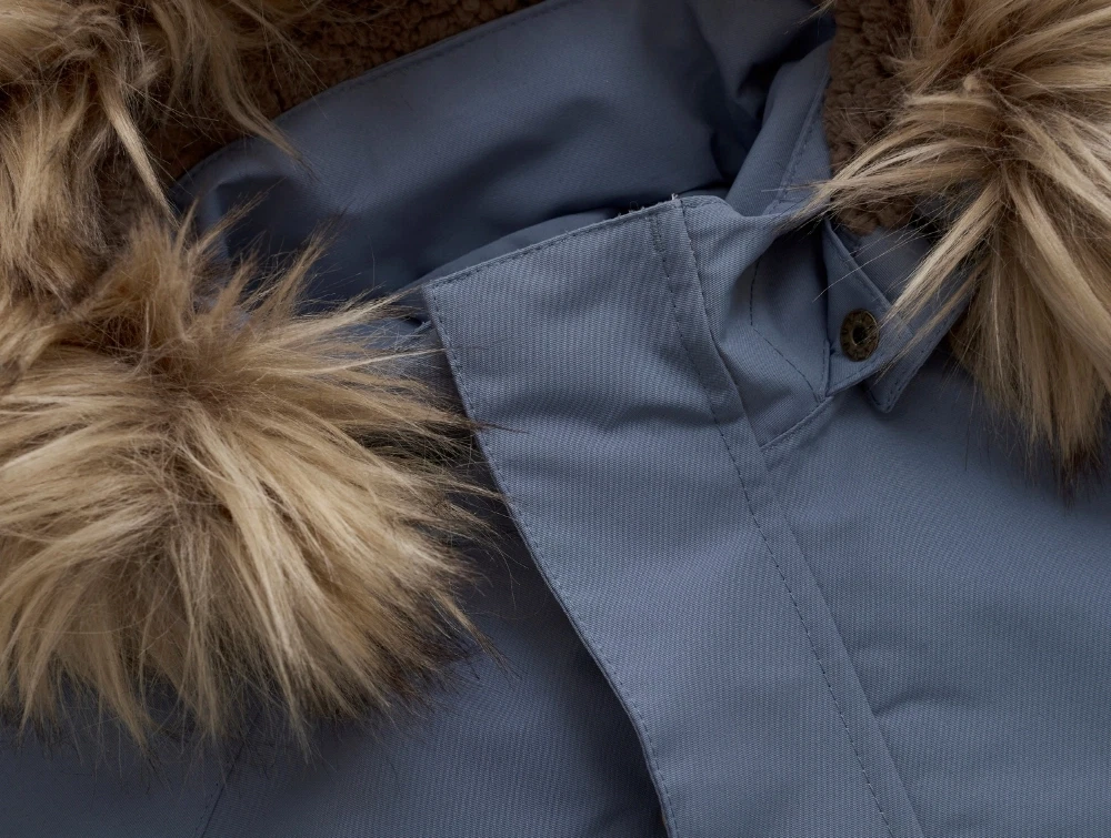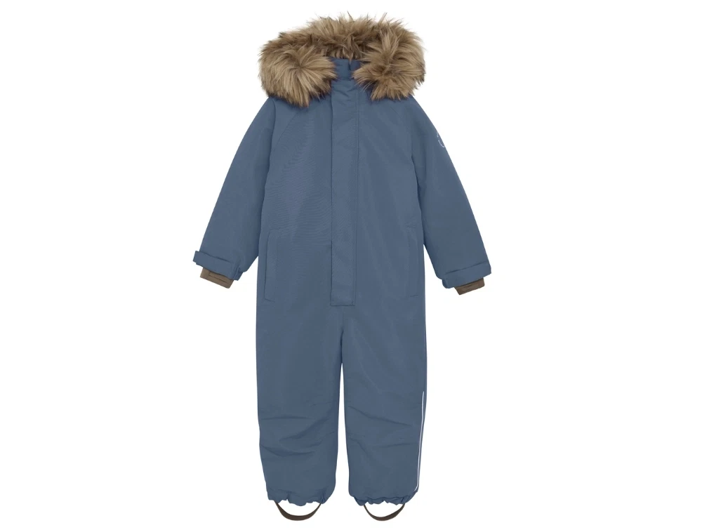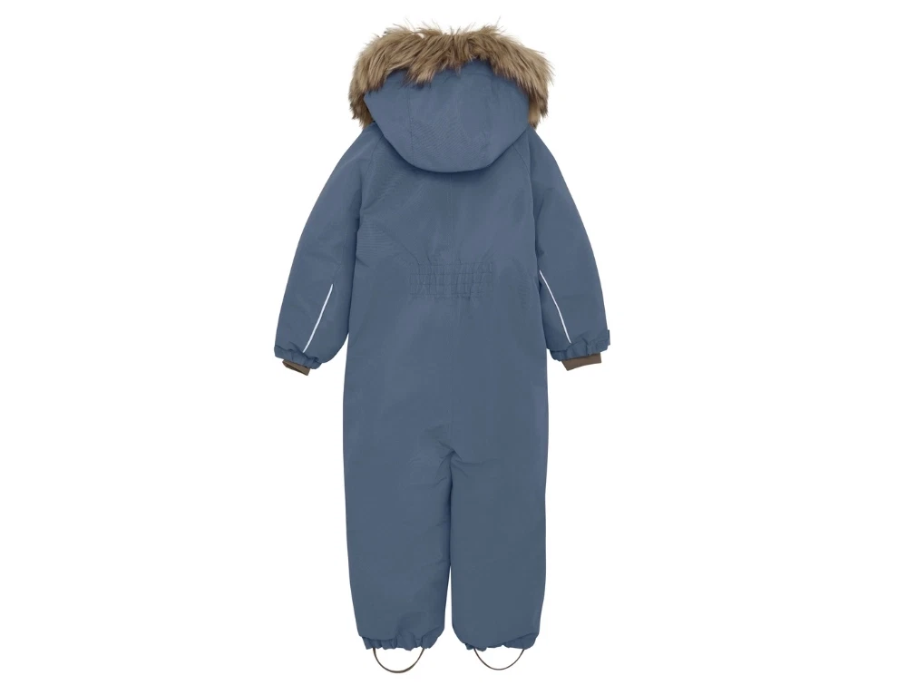 Flyverdragt i blå nuance fra En Fant med aftagelig hætte med imiteret pelskant. Den har et højt vandsøjletryk, tapede sømme og har god åndbarhed.