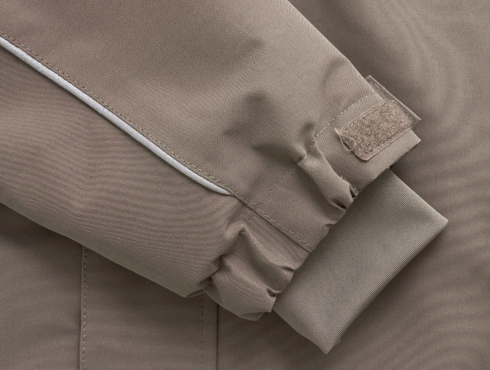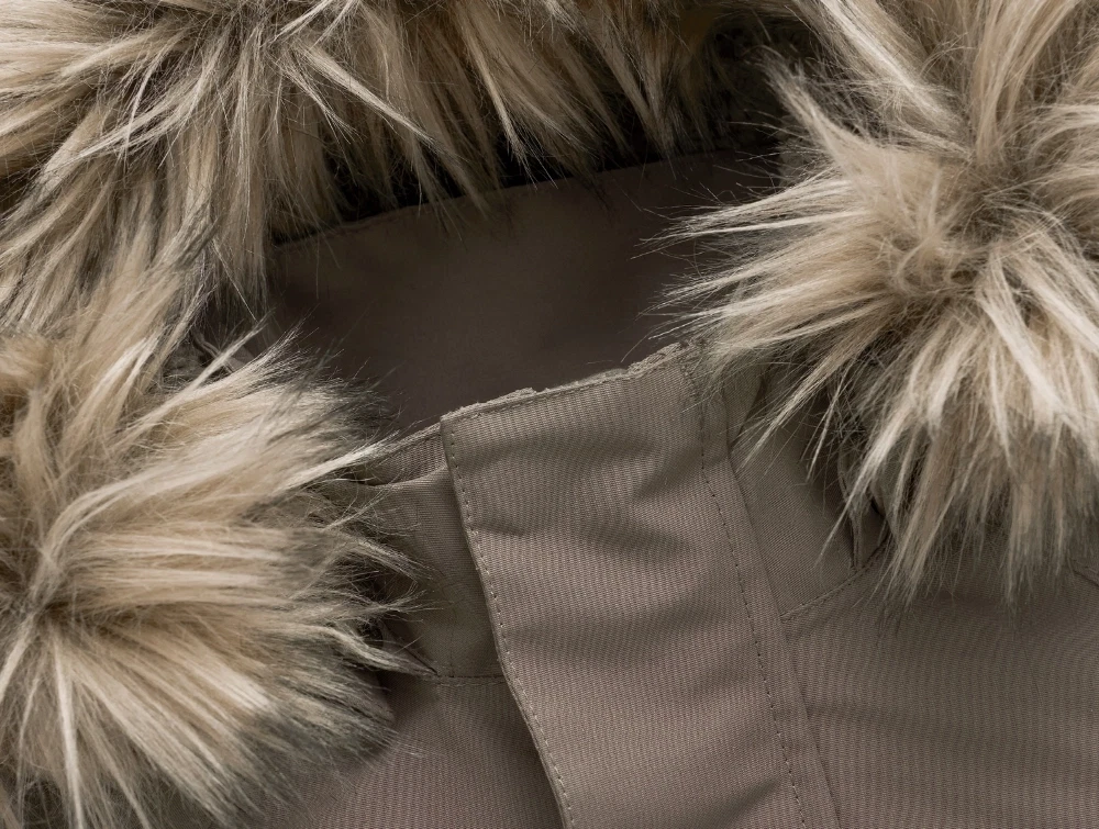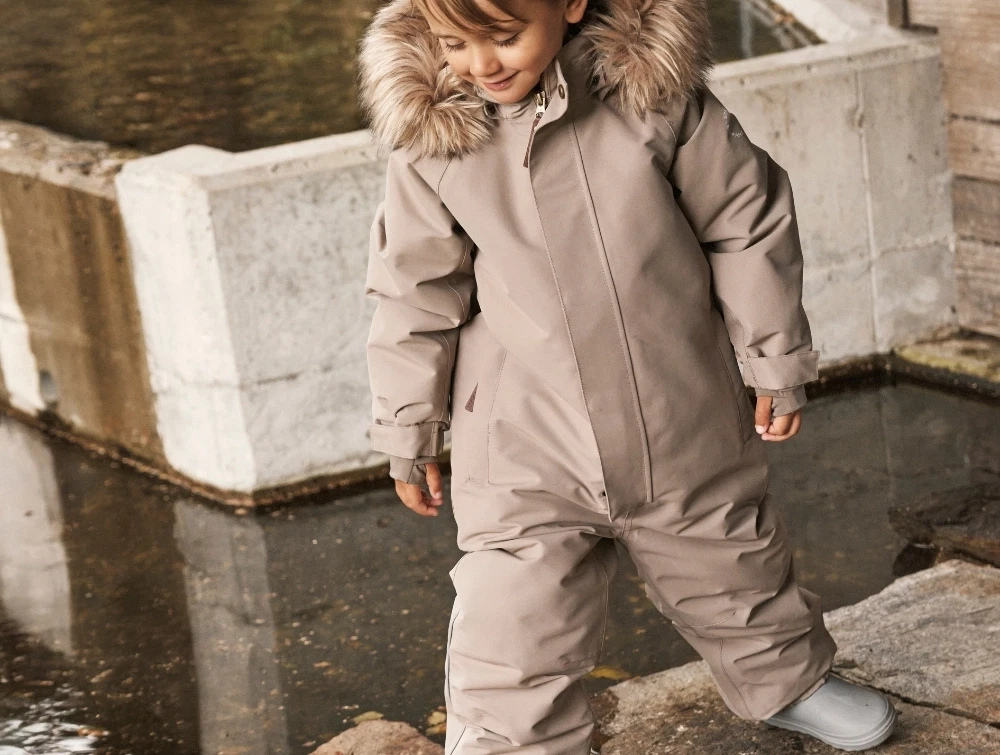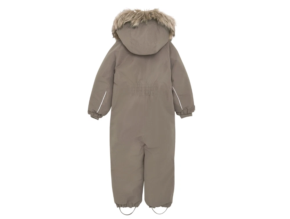En Fant flyverdragt i beige med aftagelig pelskant og tapede sømme
