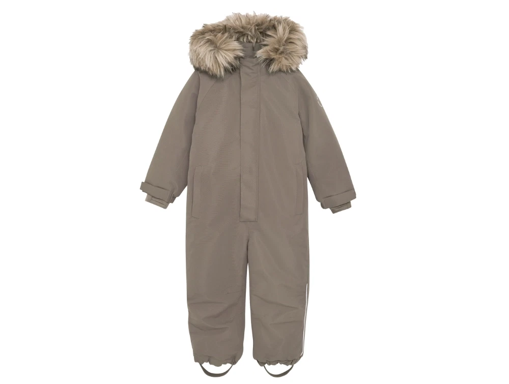 Flyverdragt i beige nuance fra En Fant med aftagelig hætte med imiteret pelskant. Den har et højt vandsøjletryk, tapede sømme og har god åndbarhed.