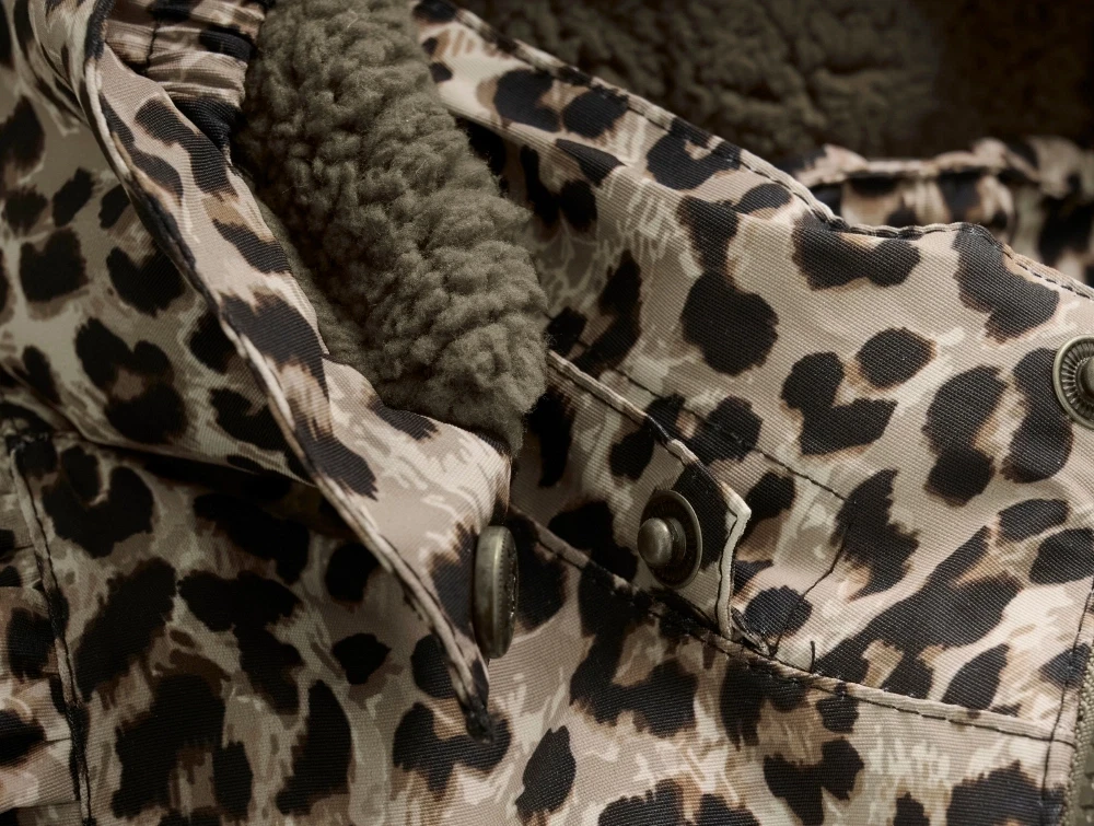 En Fant flyverdragt i pine bark med leopardprint og flæserEn Fant flyverdragt i pine bark med leopardprint og flæser set bagfraNærbillede af flæsedetalje på En Fant flyverdragt i pine bark med leopardprintNærbillede af hætte og knapper på En Fant flyverdragt i pine bark med leopardprint