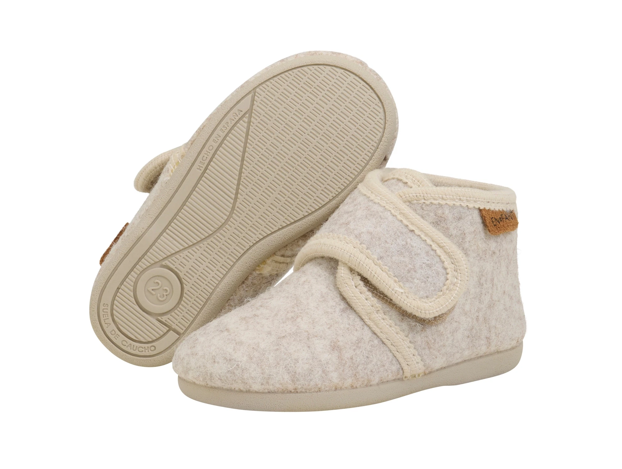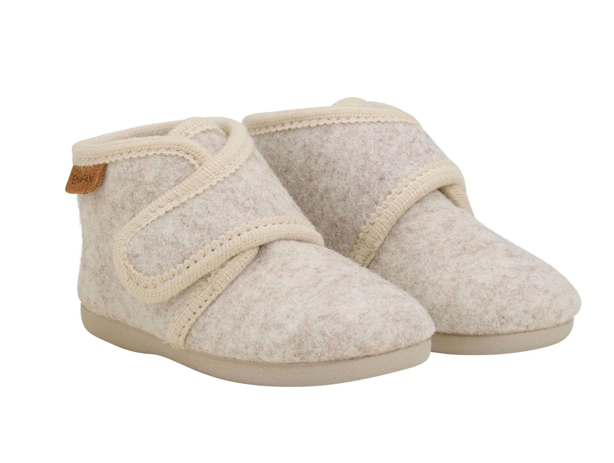 Ensfarvede uldfutter i råhvid (sand melange) fra En Fant. Futterne er fremstillet i 100% uld og har en super fleksibel og let gummisål, som samtidig er super praktisk til institutionen. De lukkes med en praktisk velcrorem over vristen, hvilket gør dem lette at tage af og på.