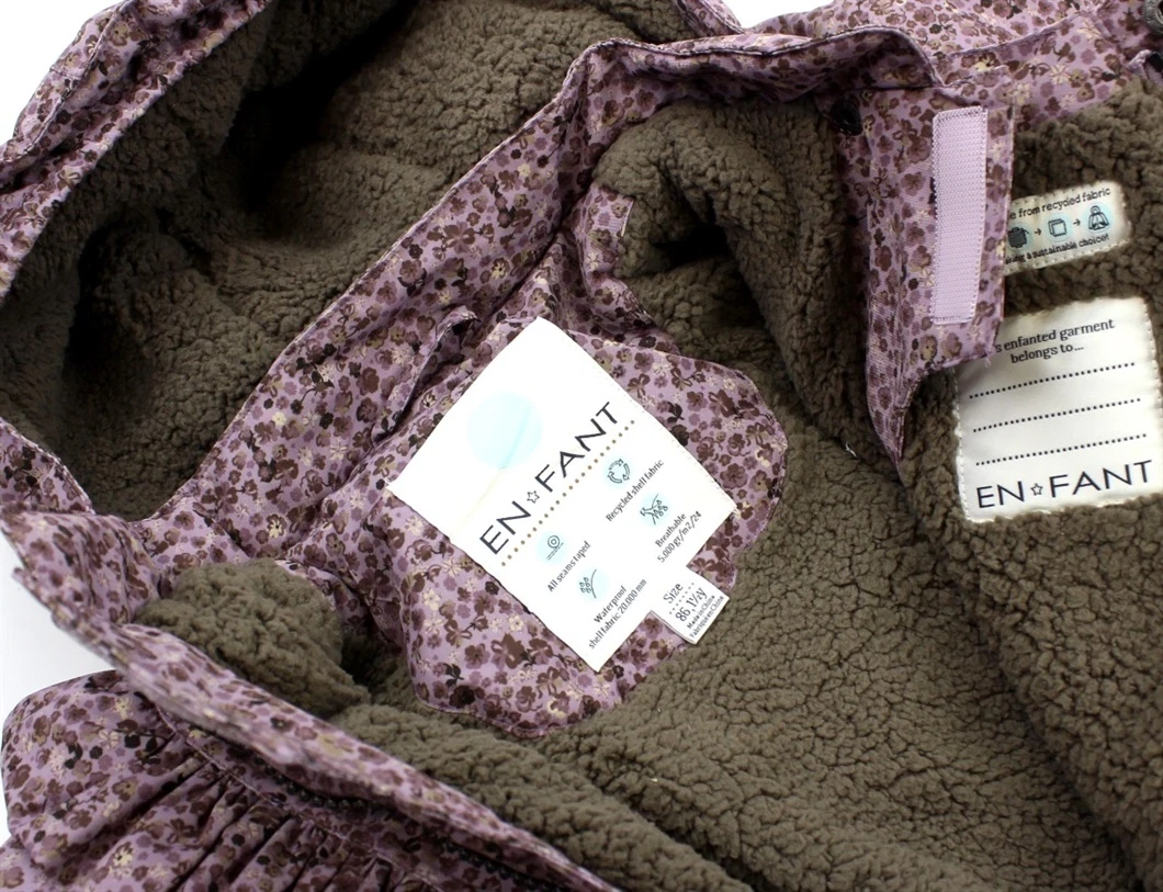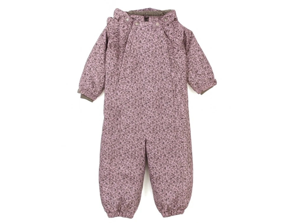 Flyverdragt i farven nirvana med flæser og blomsterprint fra En Fant. Flyverdragten har en aftagelig hætte med trykknapper.