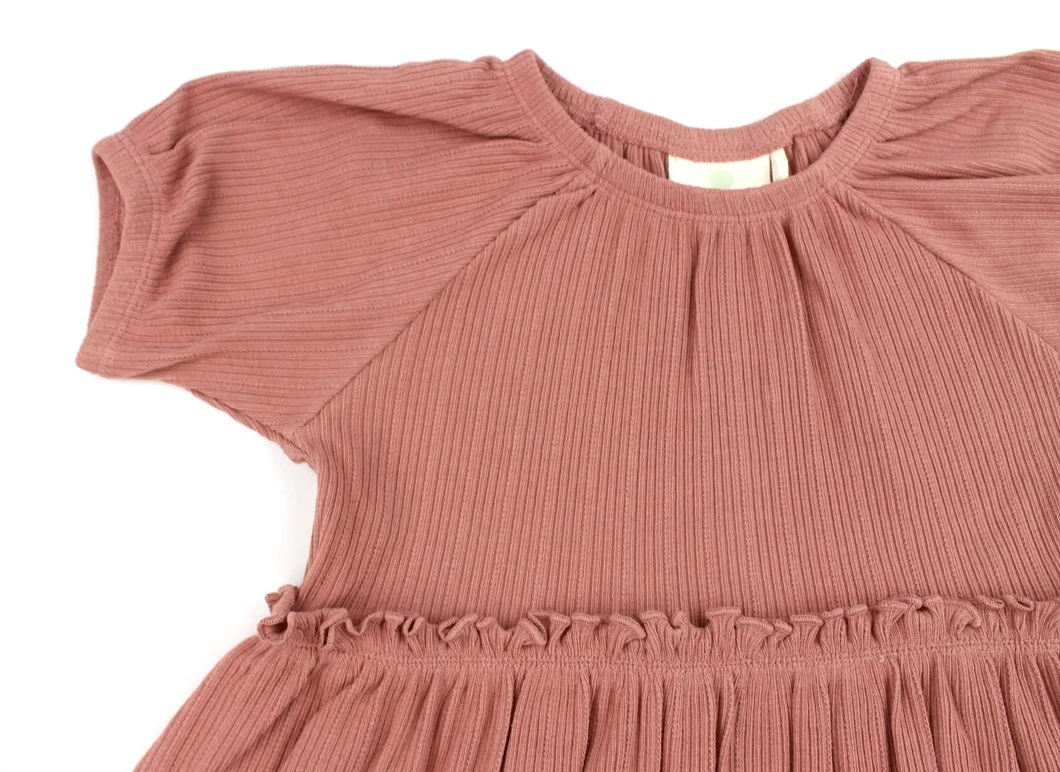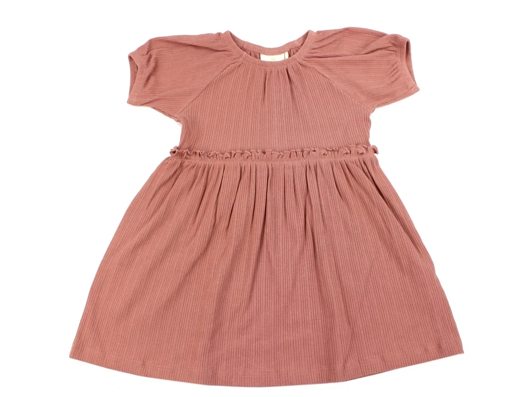 Den flotte ribkjole fra En Fant er en stilfuld tilføjelse til enhver piges garderobe. Kjolen har korte ærmer og er lavet af en blød bomuldsblanding, der føles behagelig mod huden. Elastikken ved halsen og ærmegabene sikrer en god og behagelig pasform. Med flæser og stofrynker ved den elastiske talje får kjolen et sødt og piget udseende.