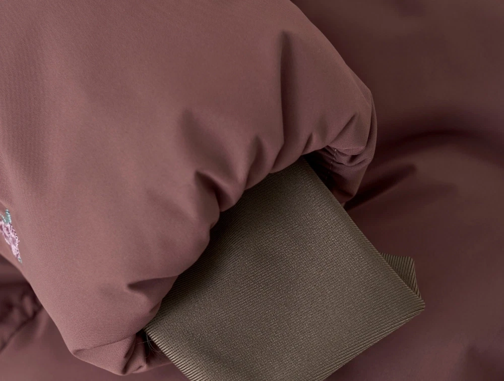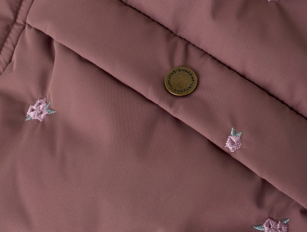 En Fant pufferjakke i rose taupe med blomsterbroderi og praktiske detaljer