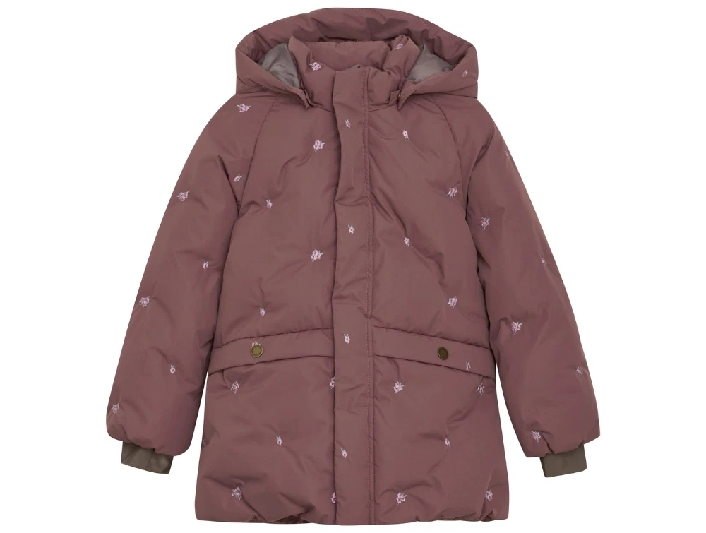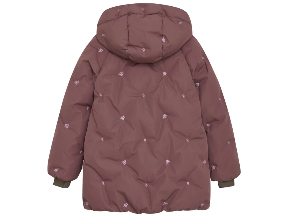 Pufferjakke i rose taupe fra En Fant med fine broderede blomster over hele jakken. Jakken er vandafvisende, åndbar og har aftagelig hætte.