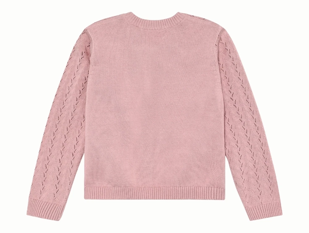 En Fant strikcardigan i zephyr rosa på pigeEn Fant strikcardigan i zephyr rosa med pointelle mønsterEn Fant strikcardigan i zephyr rosa set tæt på detaljeEn Fant strikcardigan i zephyr rosa set bagfra