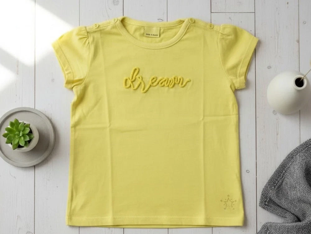 Kortærmet limegul t-shirt med applikation på brystet fra En Fant.