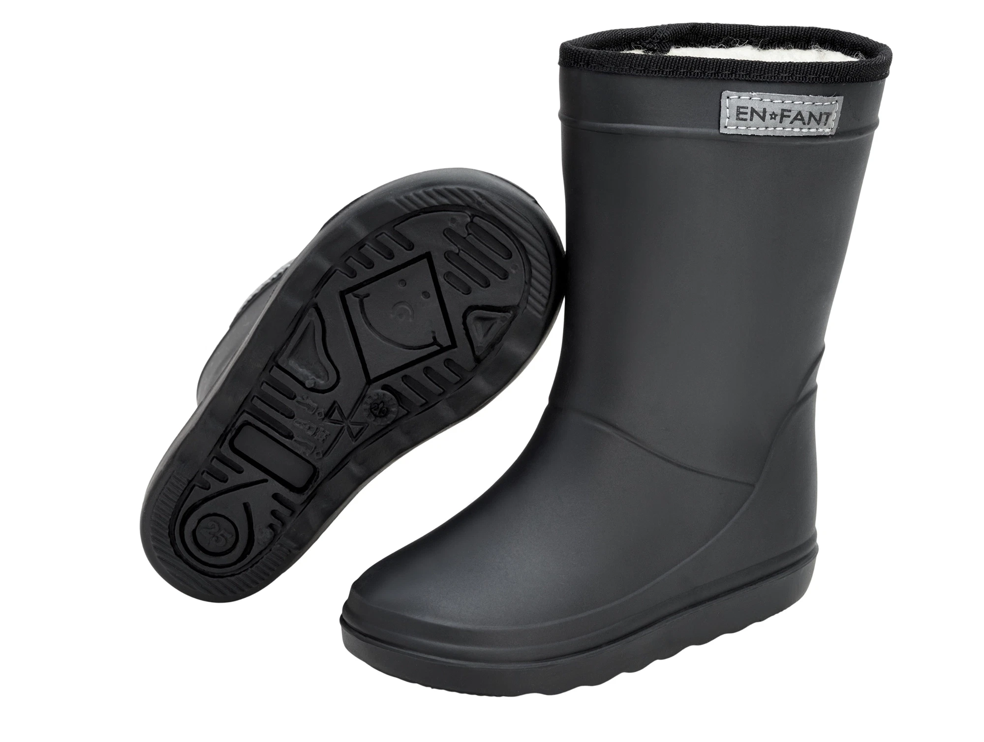 En Fant sorte termo gummistøvler med uldfoer set fra sidenEn Fant sorte termo gummistøvler med uldfoer set nedefra og fra sidenEn Fant sorte termo gummistøvler med uldfoer set fra siden
