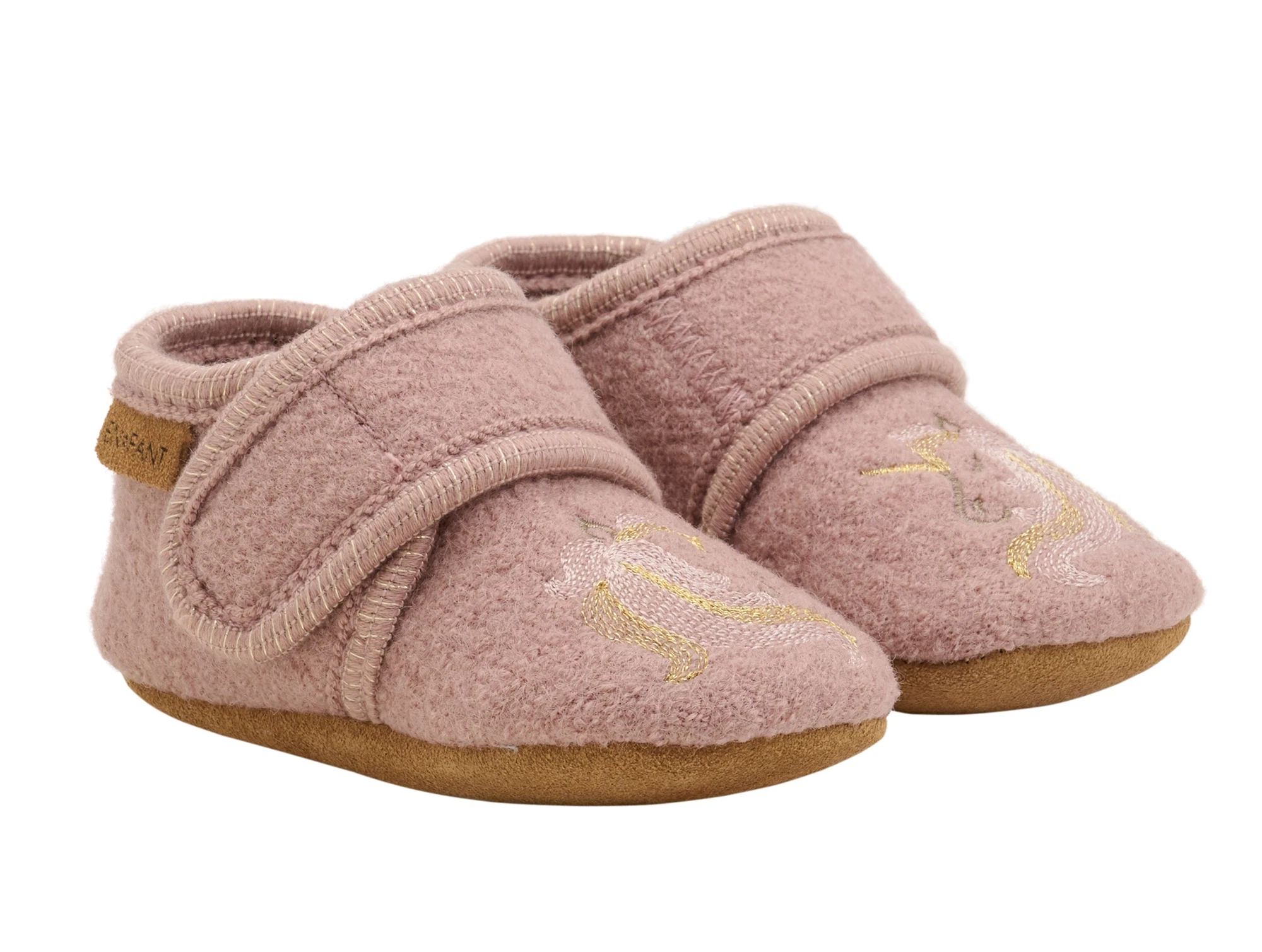Rosa uldfutter fra En Fant med broderi af enhjørning på snuden. Futterne er fremstillet i 100% uld og har en blød ruskindssål, der giver godt fodfæste indendørs. De lukkes med en praktisk velcrorem over vristen, hvilket gør dem lette at tage af og på.
