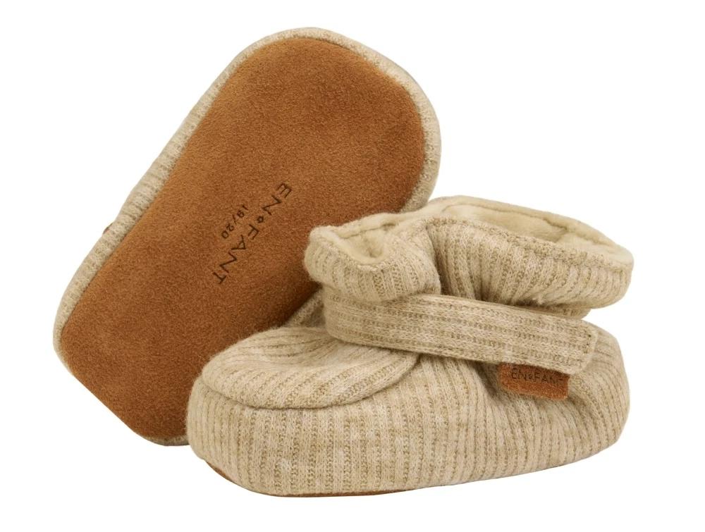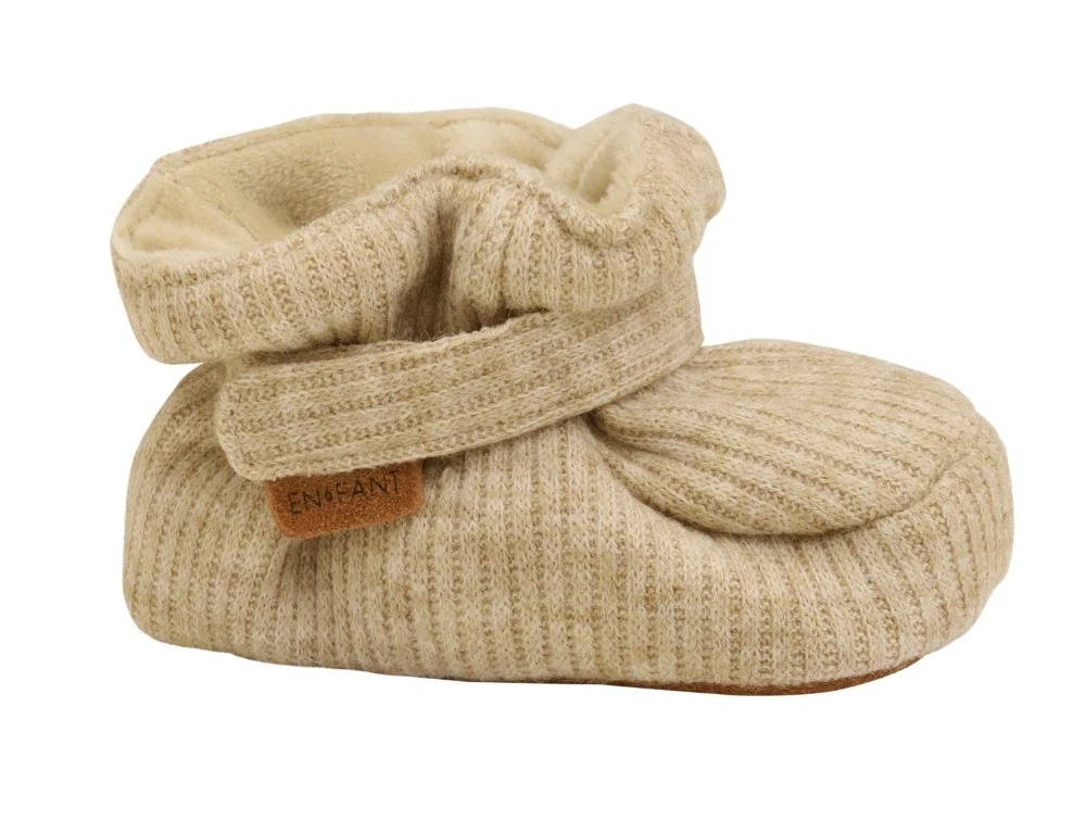 Babyfutter i beige (humus melange) fra En Fant i strikket polyester med ribstruktur. Futterne har blødt pelslignende fór, der giver ekstra varme og komfort til små fødder. De lukkes nemt med justerbart velcrobånd om anklen, så de sidder godt fast på foden. Sålene har en blød overflade, som giver et godt greb indendørs.