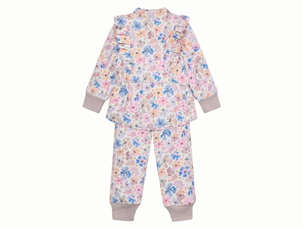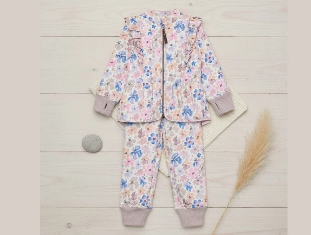 En Fant termosæt lys grå-rosa med blomsterprint og flæser