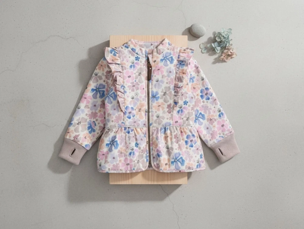 Termojakken har lynlås med hagebeskytter og er dekoreret med søde flæser på skuldrene. Den har stående krave, refleksdetalje på ryggen og brede ribmanchetter med hul til tommelfinger.