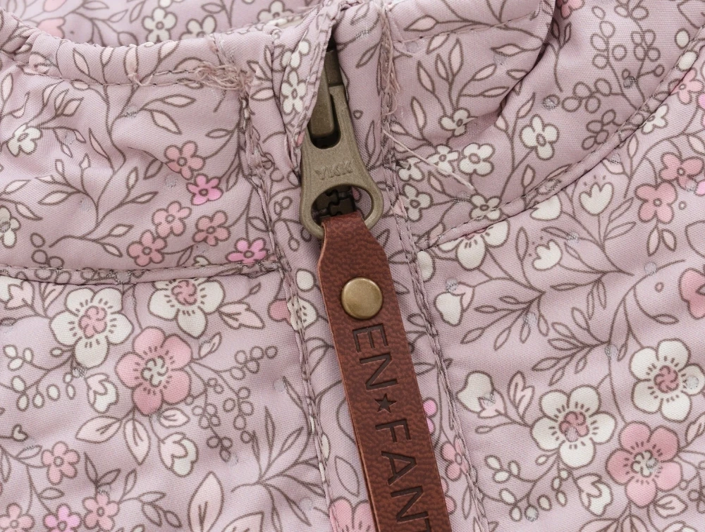 En Fant termosæt lys grå-rosa nuance med blomsterprint og flæser