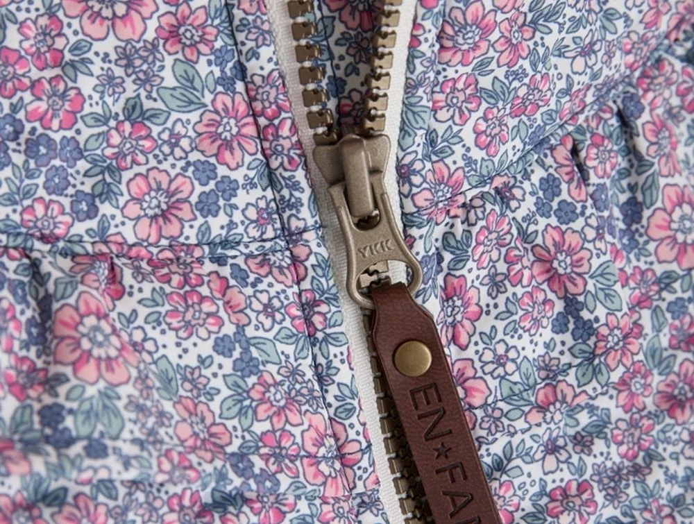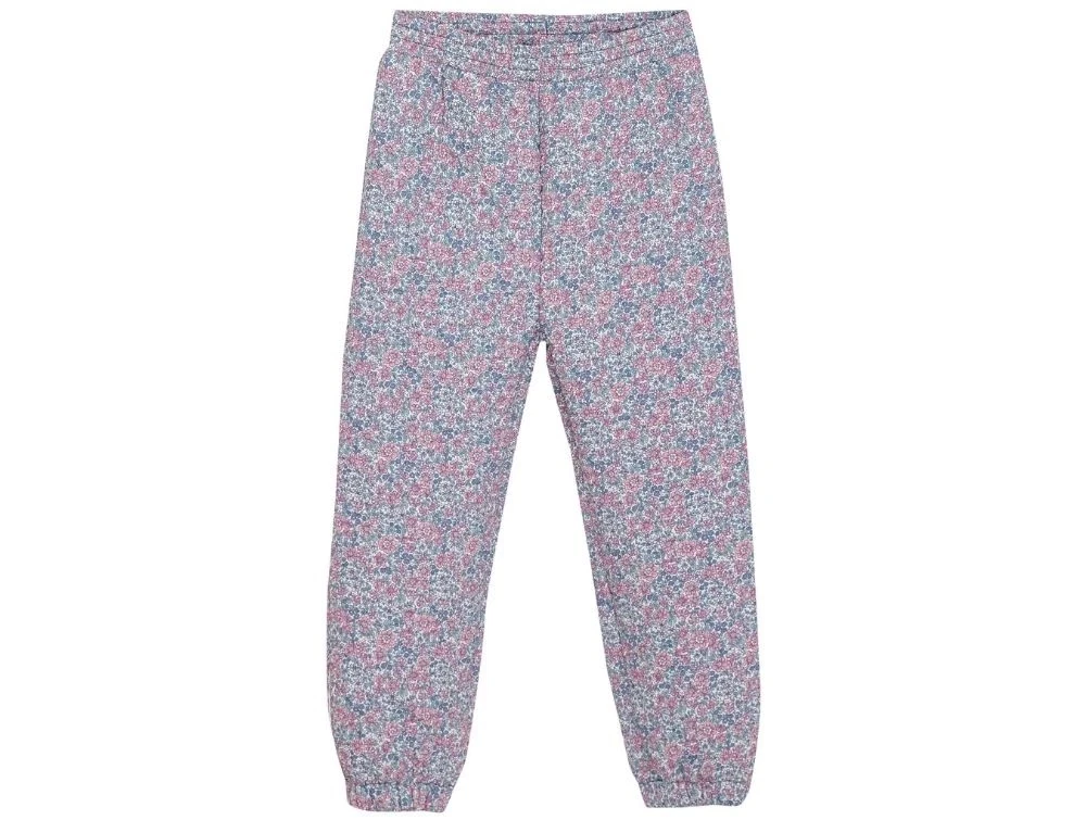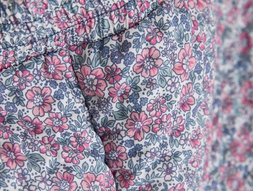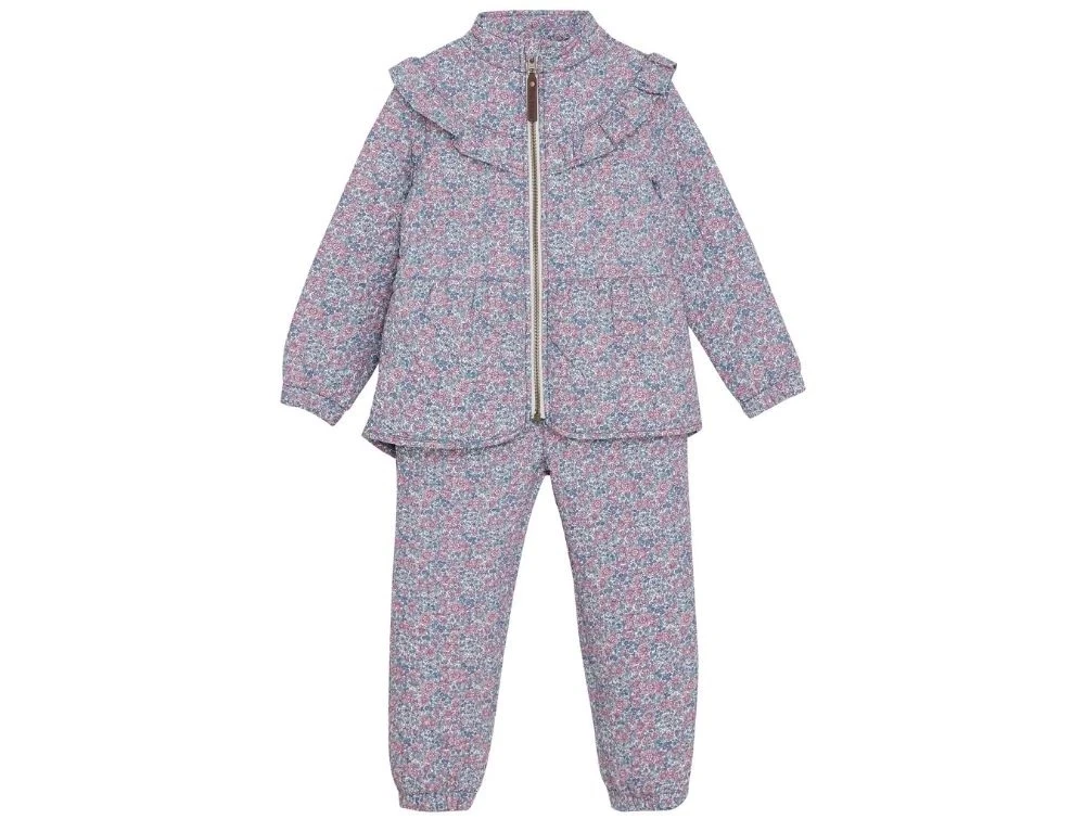 en fant termosæt i lys nuance med blomsterprint og flæser, set forfraen fant termosæt i egret med blomsterprint og figursyet pasform, set bagfraen fant termobukser med blomsterprint og rib ved anklerne, set forfranærbillede af lynlås og blomsterprint på termosæt fra en fantnærbillede af lomme og blomsterprint i quiltet struktur fra en fant termosæt