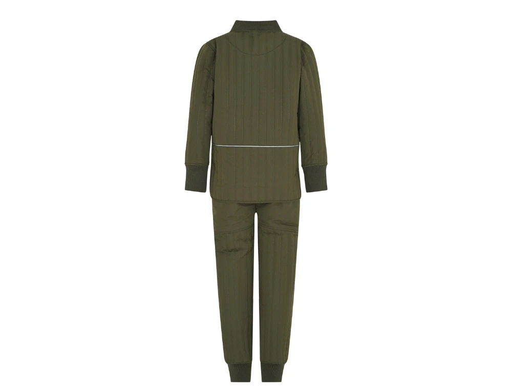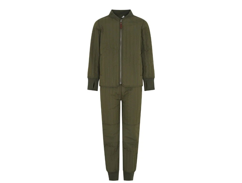 En Fant termosæt i grøn nuance er et let og funktionelt sæt med quiltet struktur, der egner sig til overgangsperioder. Sættet består af jakke og bukser med en almindelig pasform og en blød, let polstret kvalitet, som giver varme uden at fylde.