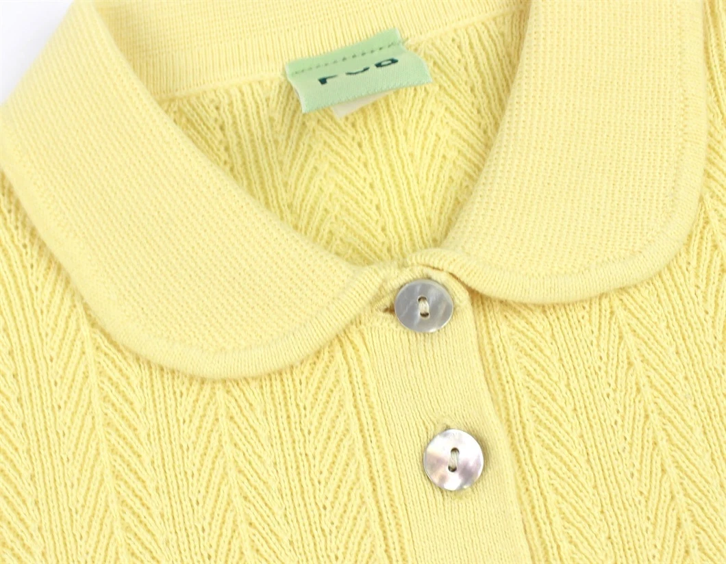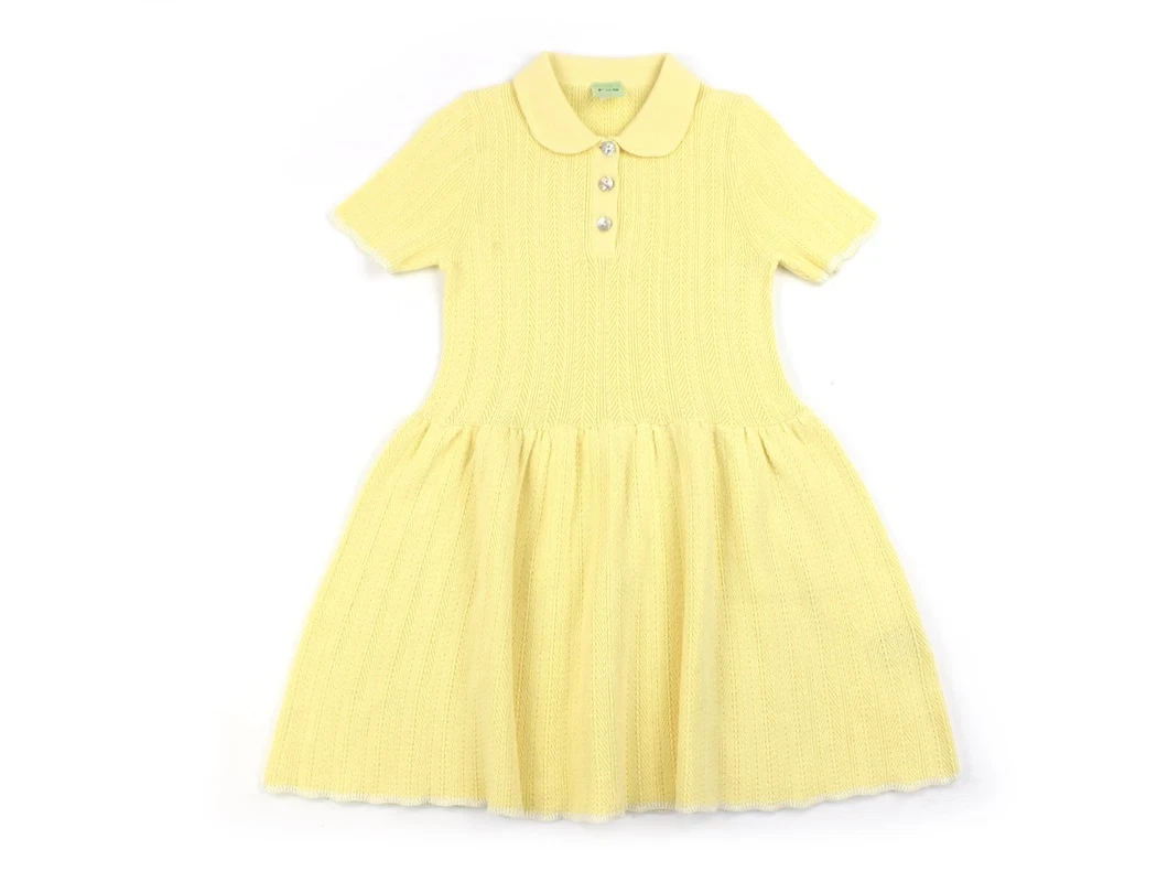 Fineste strikkjole i økologisk bomuld i farven corn med lille krave og hvide strikafslutninger på skørt og ærmer fra FUB.