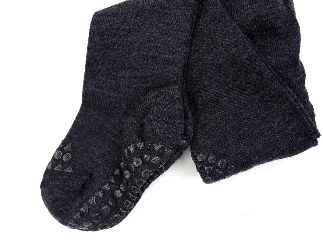 Strømpebukser i farven dark grey melange fra GoBabyGo. Strømpebukserne har gummidutter på knæ, under fødderne og på tæer, så barnet ikke glider, når det skal lære at kravle og gå.