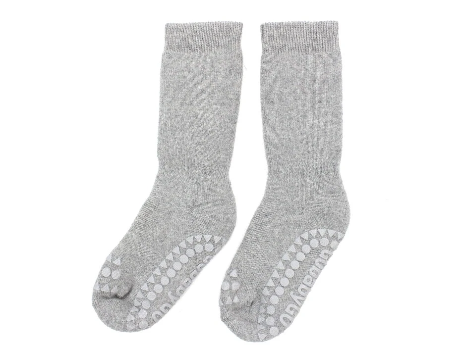 2 par grå strømper fra GoBabyGo med skridsikre såler og gummidutter på tæerne. Produceret i 80% bomuld, 17% polyamid og 3% elastan. Oeko-Tex.