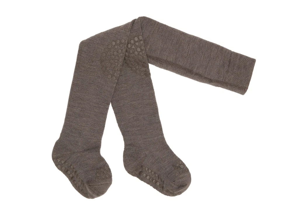 Kravlestrømpebukser i brun nuance fra GoBabyGo. Fremstillet i blød merinould og designet med gummidutter på knæ, under fødderne og oven på tæerne, så barnet får bedre greb, når det lærer at kravle og gå.