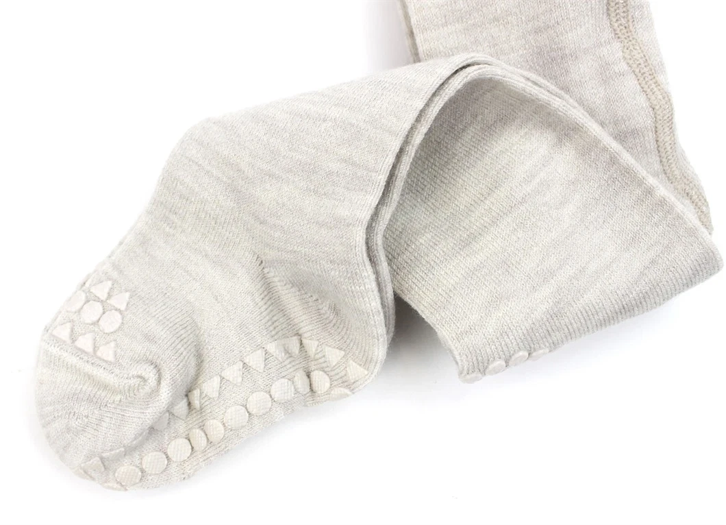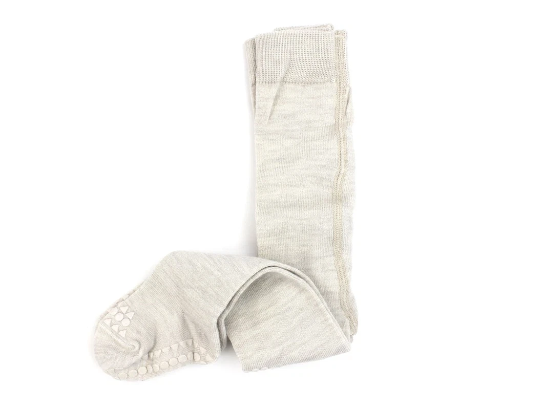 Strømpebukser i farven sand fra GoBabyGo. Strømpebukserne har gummidutter på knæ, under fødderne og på tæer, så barnet ikke glider, når det skal lære at kravle og gå.