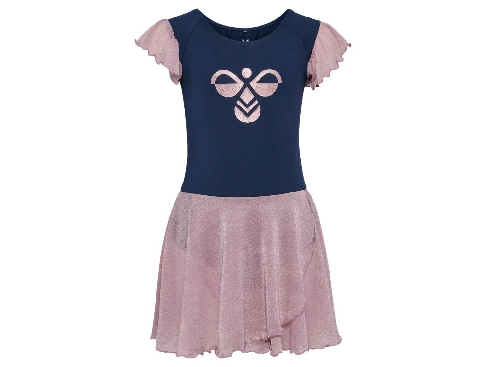 Modellen har korte ærmer med glimmer og et let skørt i samme glitrende materiale. På brystet ses et hummel logo med glitterprint, og bagpå er der nøglehulslukning med knap for nem påklædning.