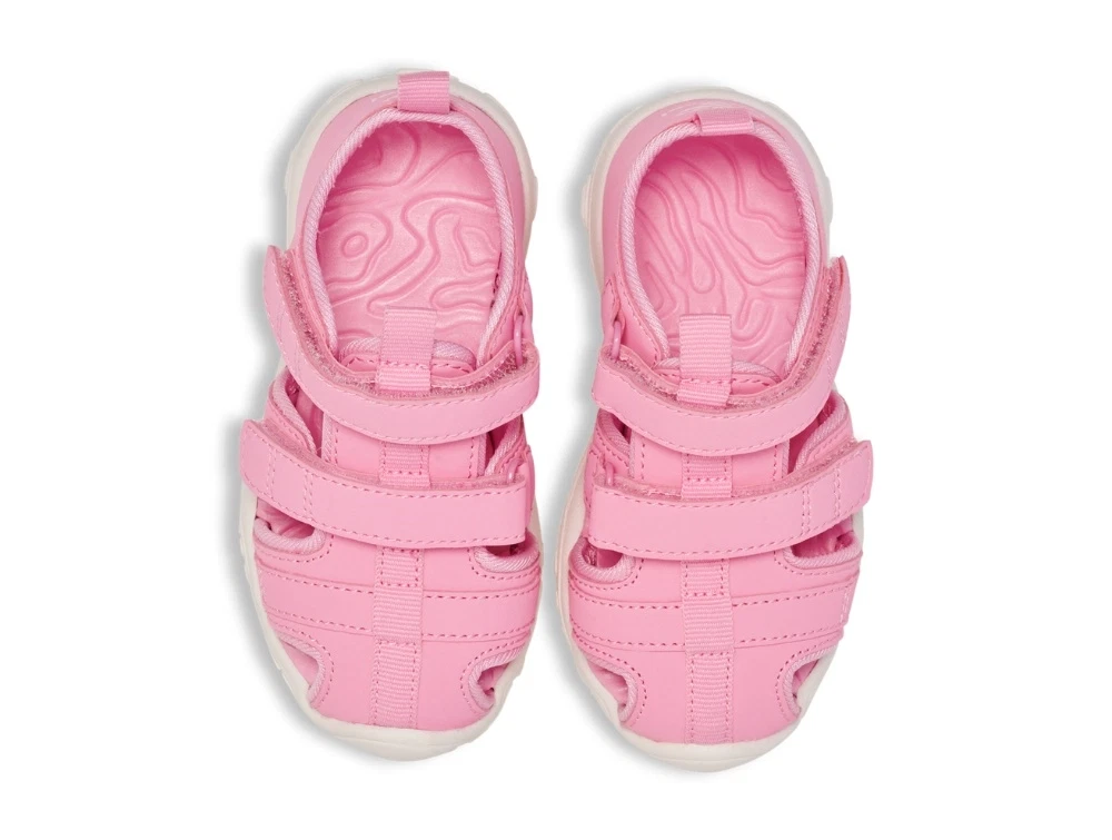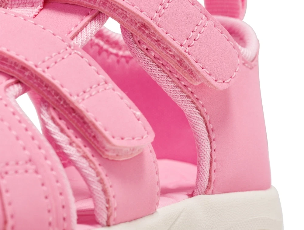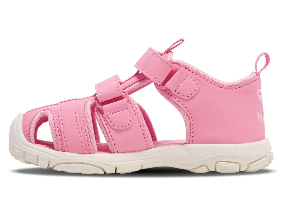 Sandal i lyserød nuance fra Hummel med lukket tå, der beskytter små tæer under leg. Modellen har et enkelt og funktionelt design med bløde materialer og praktiske velcrolukninger.