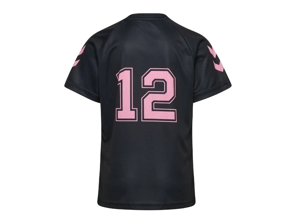 Hummel sportssæt i sort med rosa detaljer set forfraHummel sportssæt i sort med rosa 12-print detaljeHummel sportssæt T-Shirt i sort med rosa detaljer set bagfraHummel shorts i sort med rosa detaljer