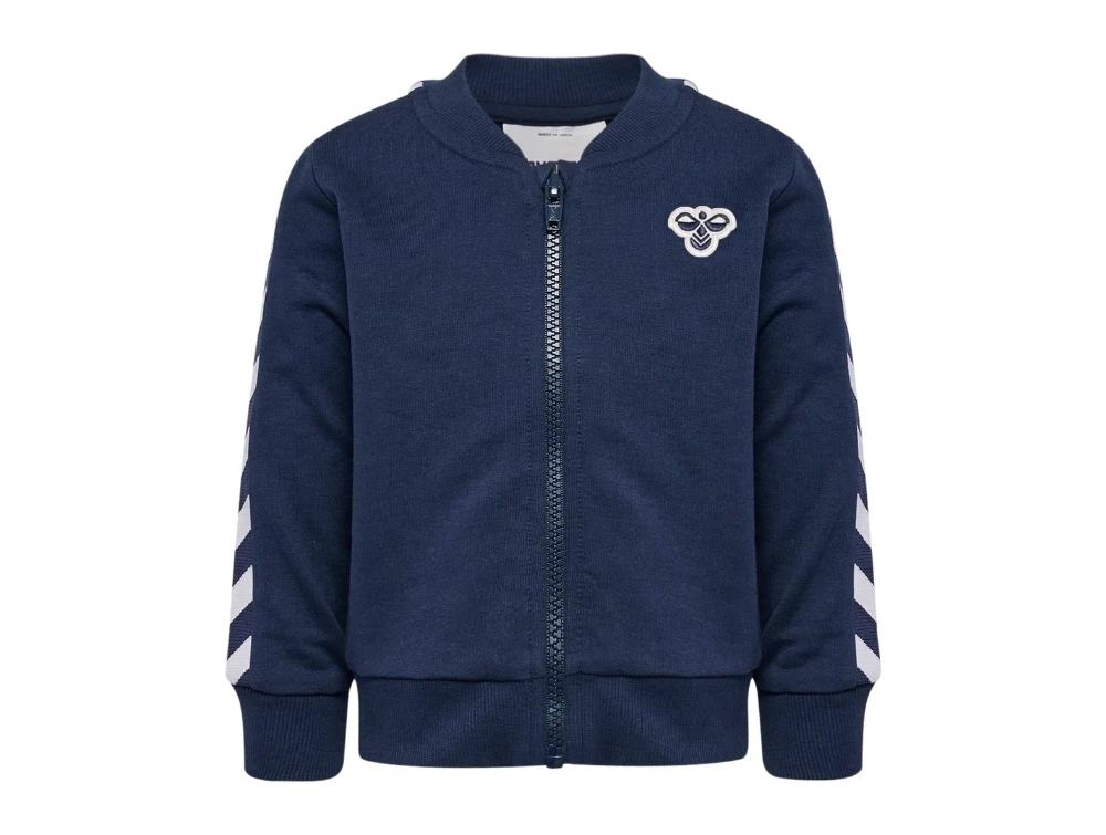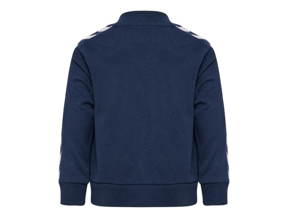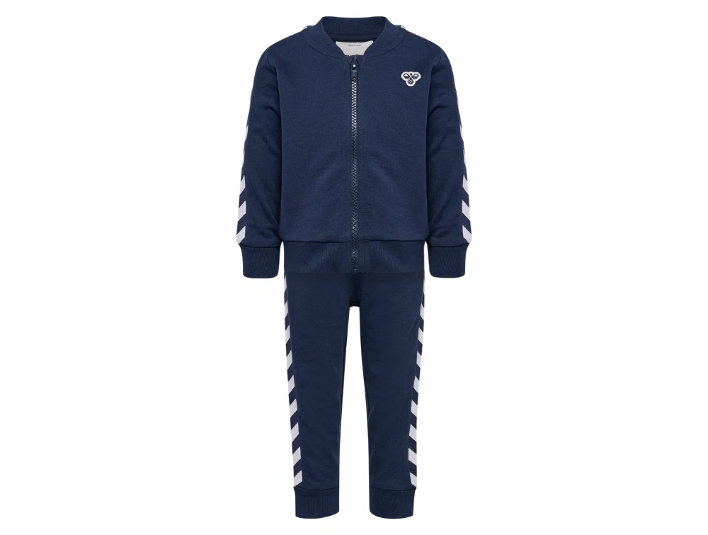 Hummel sweatsæt i mørkeblå til børn set forfraHummel sweatjakke i mørkeblå med lynlås og broderet logoHummel sweatjakke i mørkeblå set bagfraHummel sweatbukser i mørkeblå med chevronbånd på beneneHummel sweatbukser i mørkeblå set bagfra