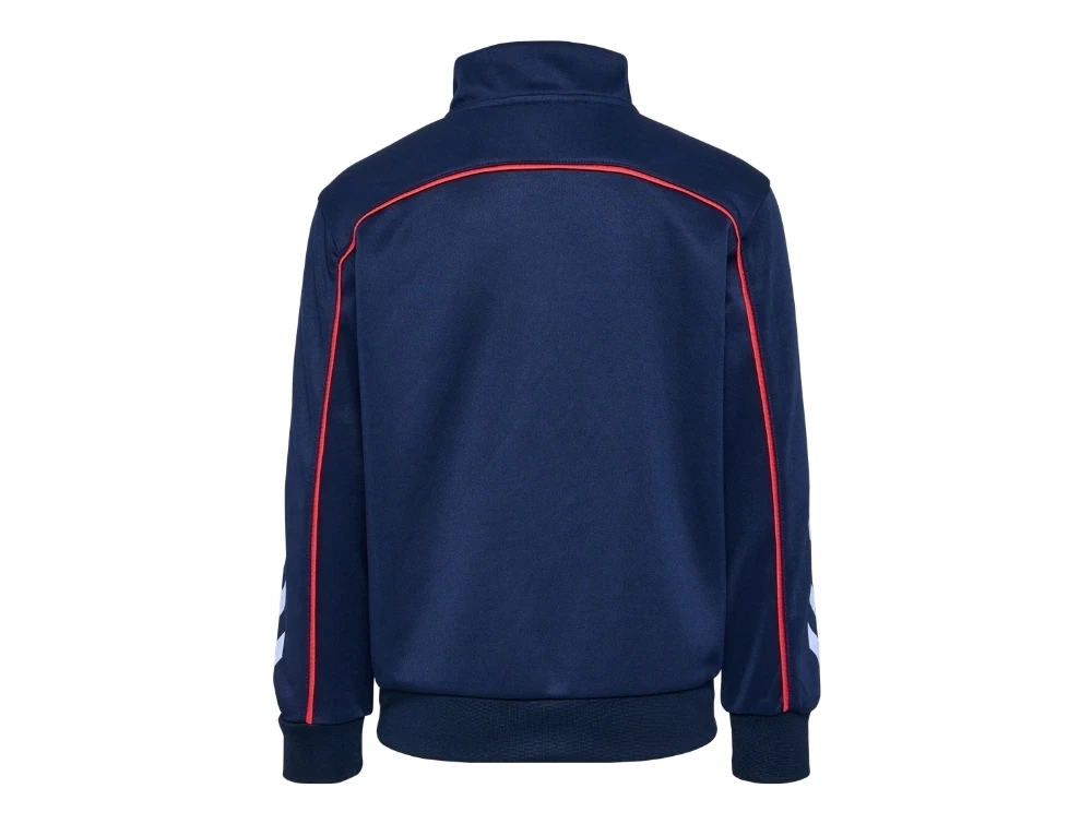 Jakken har gennemgående lynlås, høj krave og ribkant ved ærmer og talje. Bukserne har elastik i taljen med justerbar snøre for en fleksibel pasform. På ærmer og ben ses Hummels chevron logo detalje, som er en del af brandets velkendte design.
