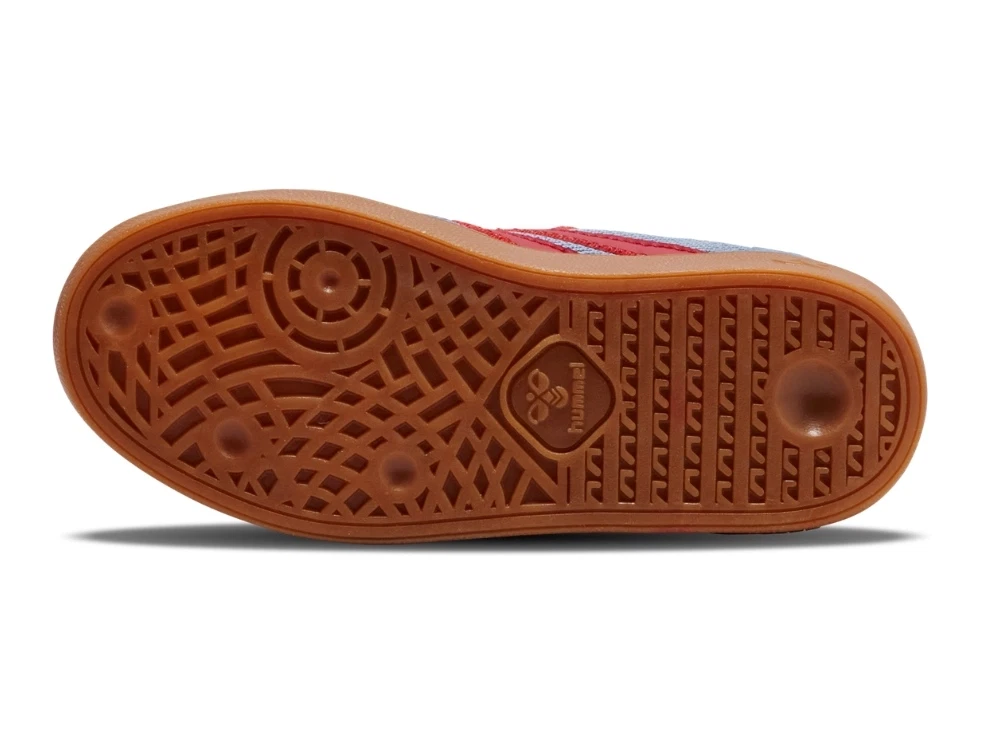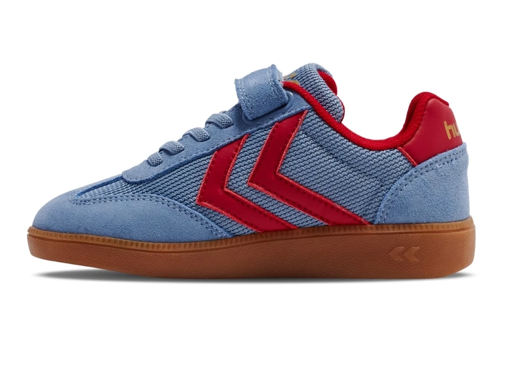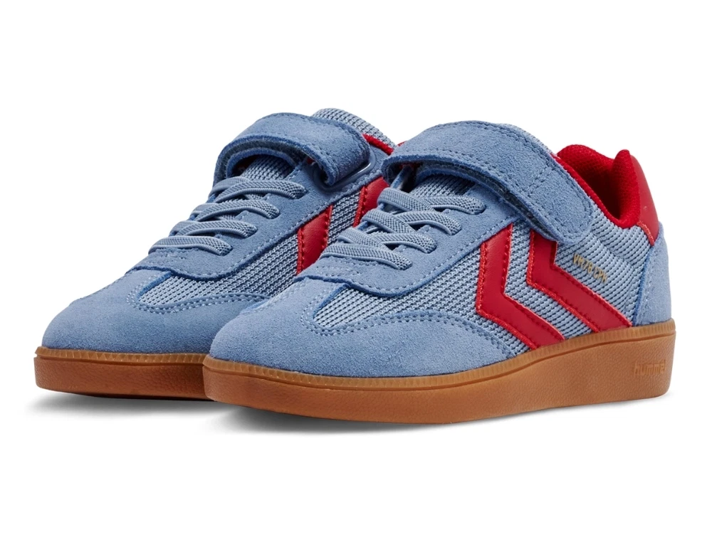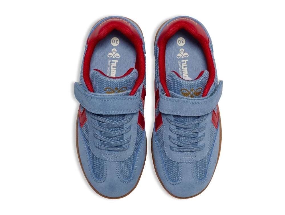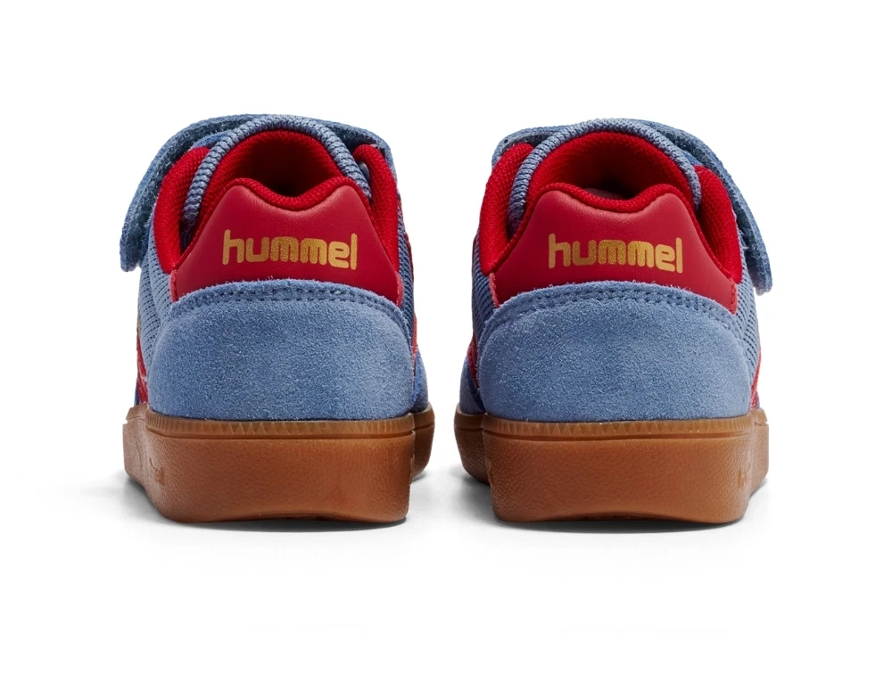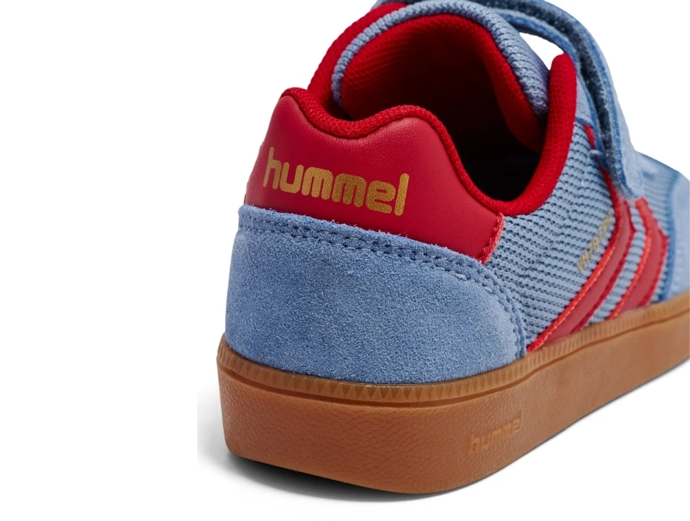 Skoen er designet med elastiske snørebånd og velcrorem over vristen, som gør den nem for børn selv at tage af og på. Den flade gummisål giver stabil kontakt med underlaget og et retroinspireret udtryk, der kendetegner hummels klassiske sneakers.