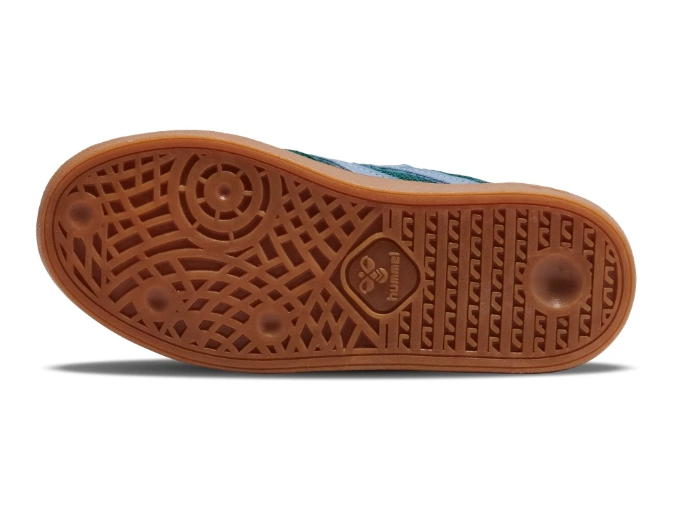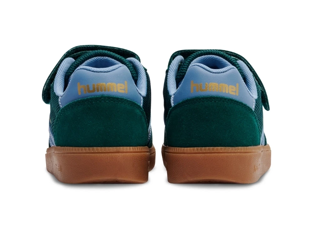 Skoen er designet med elastiske snørebånd og velcrorem over vristen, så den er nem for børn at tage af og på selv. Den flade gummisål giver stabil kontakt med underlaget og et retroinspireret udtryk, der kendetegner hummels klassiske sneakers.