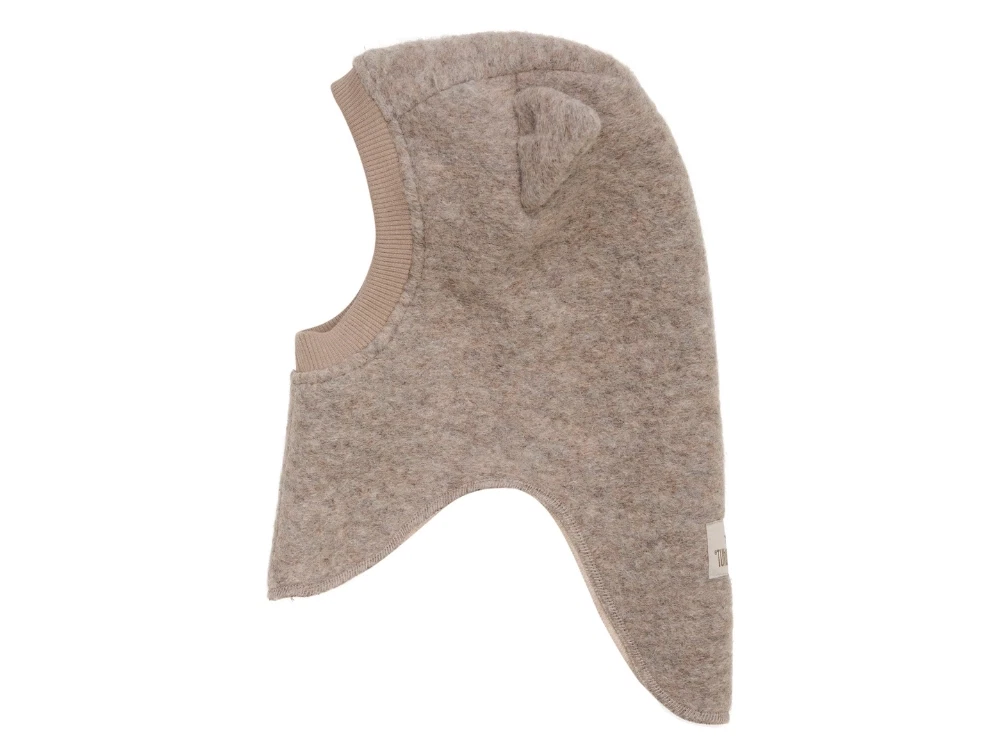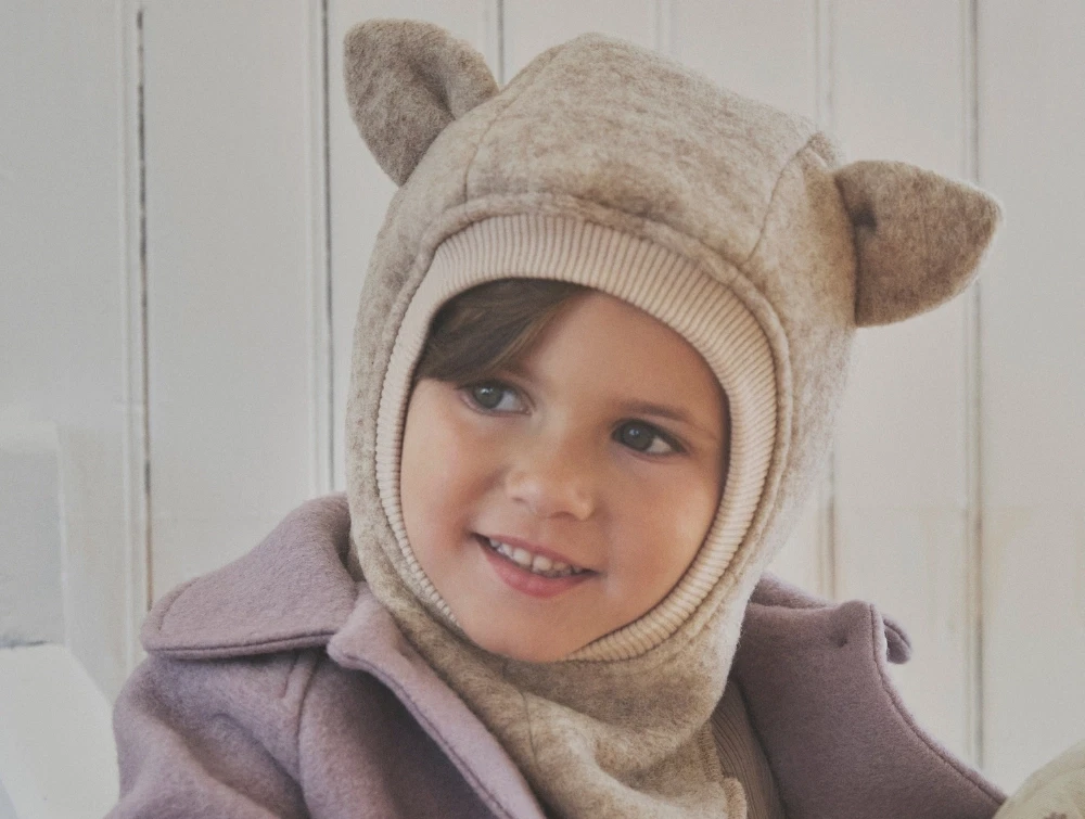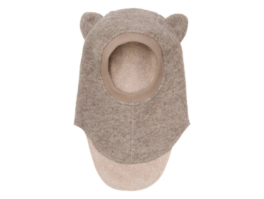 Huttelihut balaclava camel melange med bjørneører set forfra på barnNærbillede af Huttelihut balaclava camel melange ved ansigtsåbningHuttelihut balaclava camel melange vist forfraHuttelihut balaclava camel melange vist fra siden