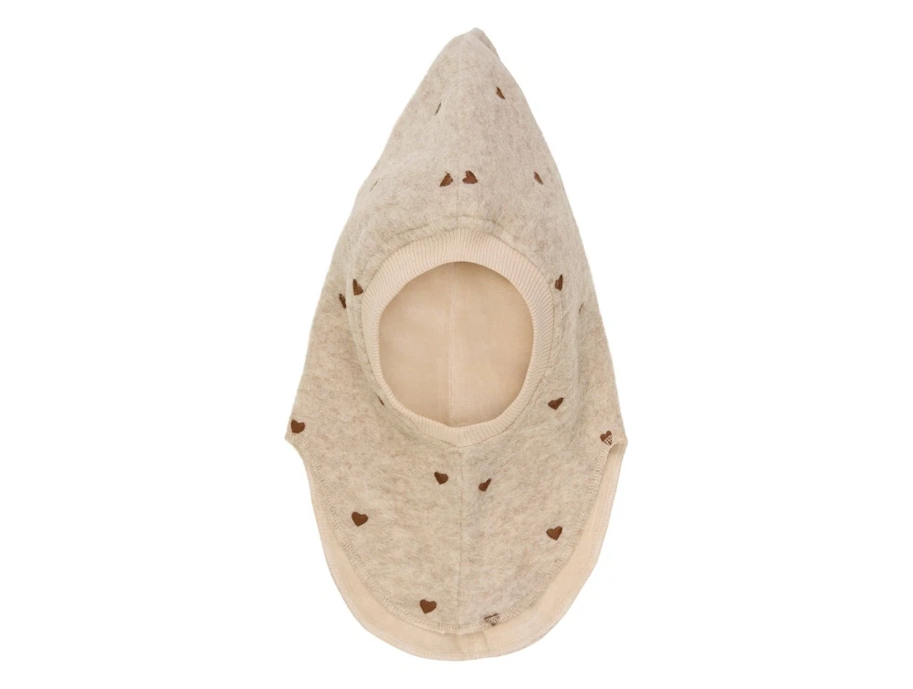 Elefanthuen har en spids form og dækker hoved, ører og hals. Den fine sandfarvede nuance kombineret med små hjertebroderier giver et sødt udtryk. Huen har et blødt bomuldsfoer, som føles behageligt mod barnets hud.