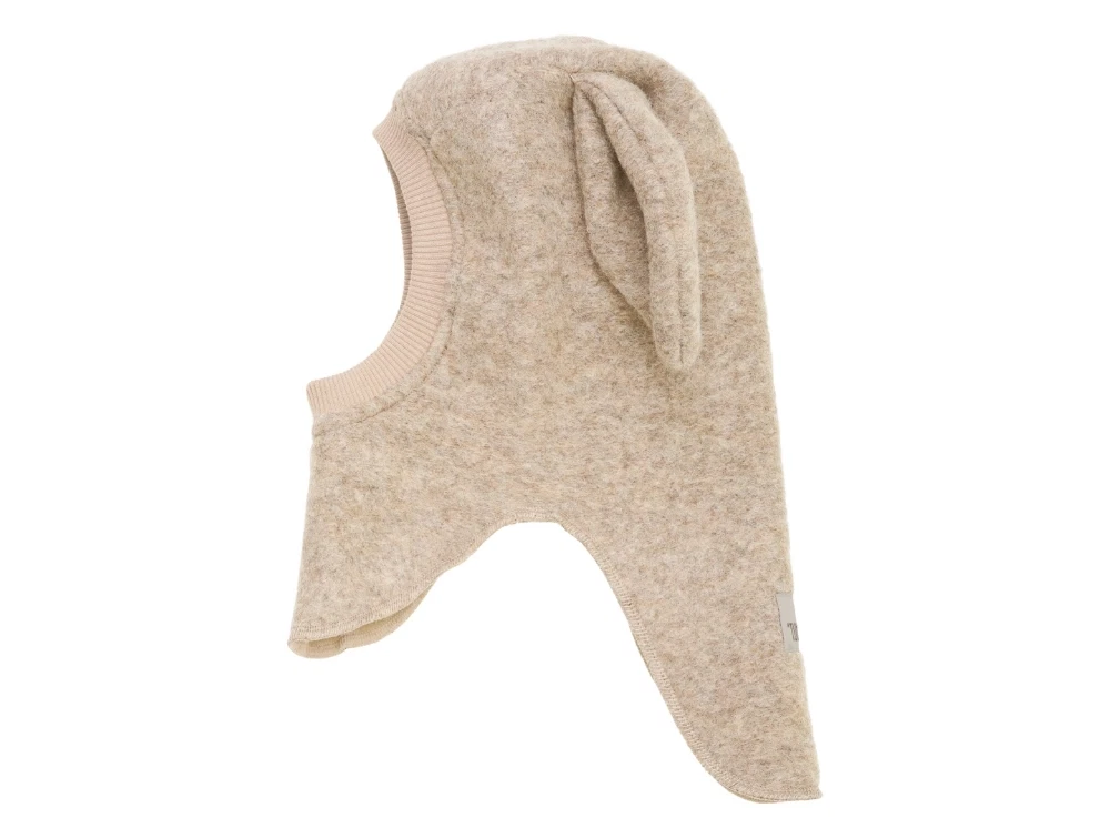 Elefanthue i sandfarvet nuance fra Huttelihut med lange, bløde ører og blød ribkant ved ansigtet. Elefanthuen er lavet i en uldblanding og foret med blødt bomuldsfoer, som føles behageligt mod huden.