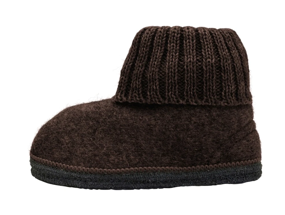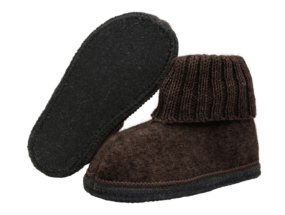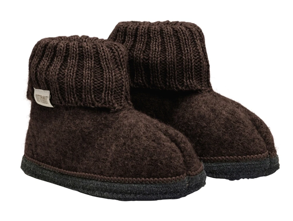 HUTTEliHUT hjemmesko i mørkebrun uld. Fremstillet i kraftig uldkvalitet med ribstrikket skaft ved anklen, som sikrer en god pasform og ekstra varme til børnefødder.