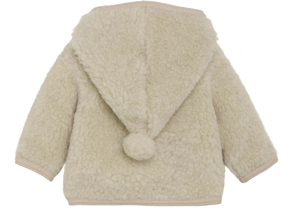 Uldjakke i råhvid nuance fra Huttelihut. Jakken har en blød, vamset overflade og spids hætte med kvast.