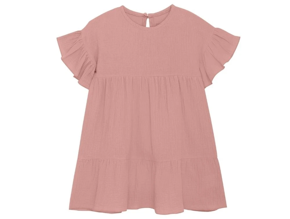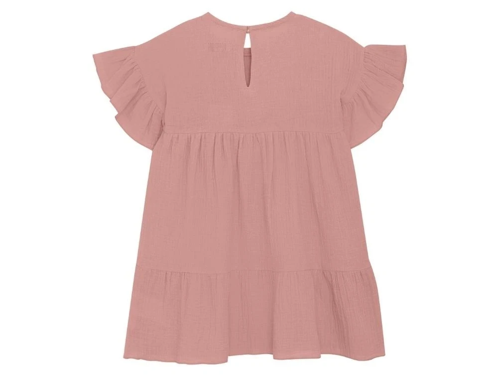 Kjole i vævet muslin fra Huttelihut i støvet rosa nuance (ash rose). Modellen har korte flæseærmer og skæring med rynker, der giver kjolen et feminint og luftigt udtryk. Lukkes med en lille knap i nakken.