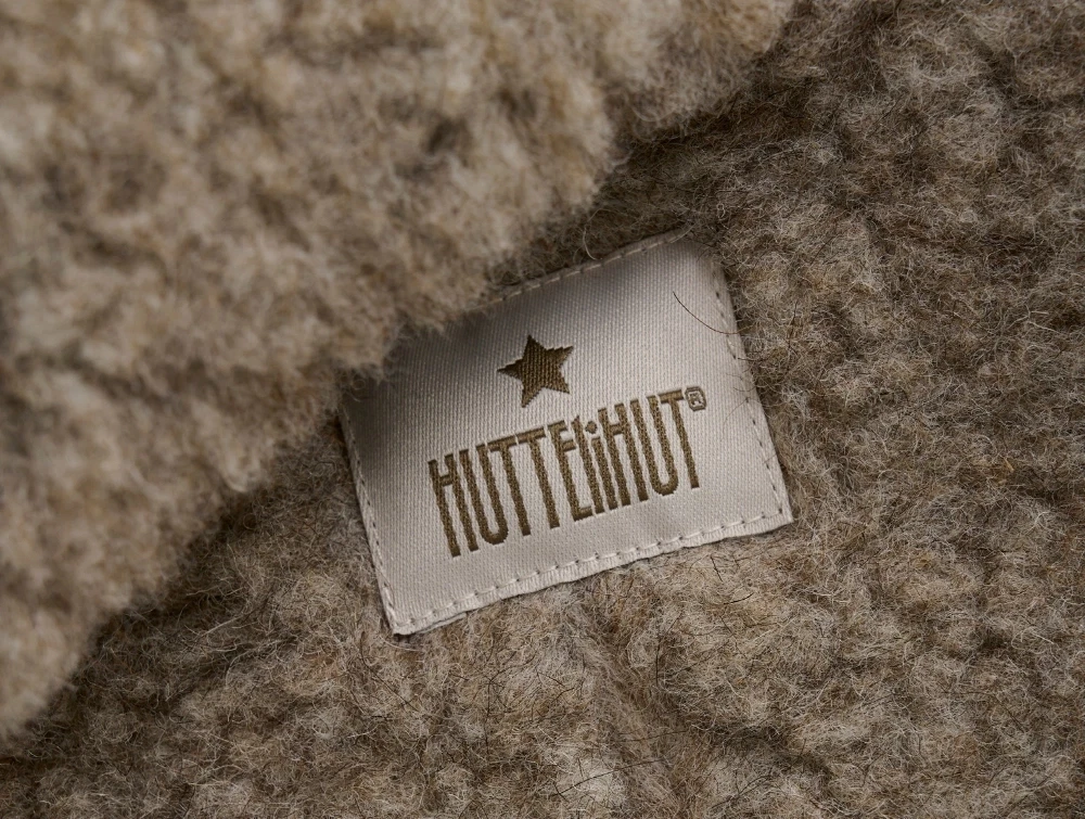 Huttelihut ulddragt i camel melange med teddy look og hætte
