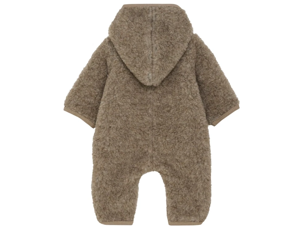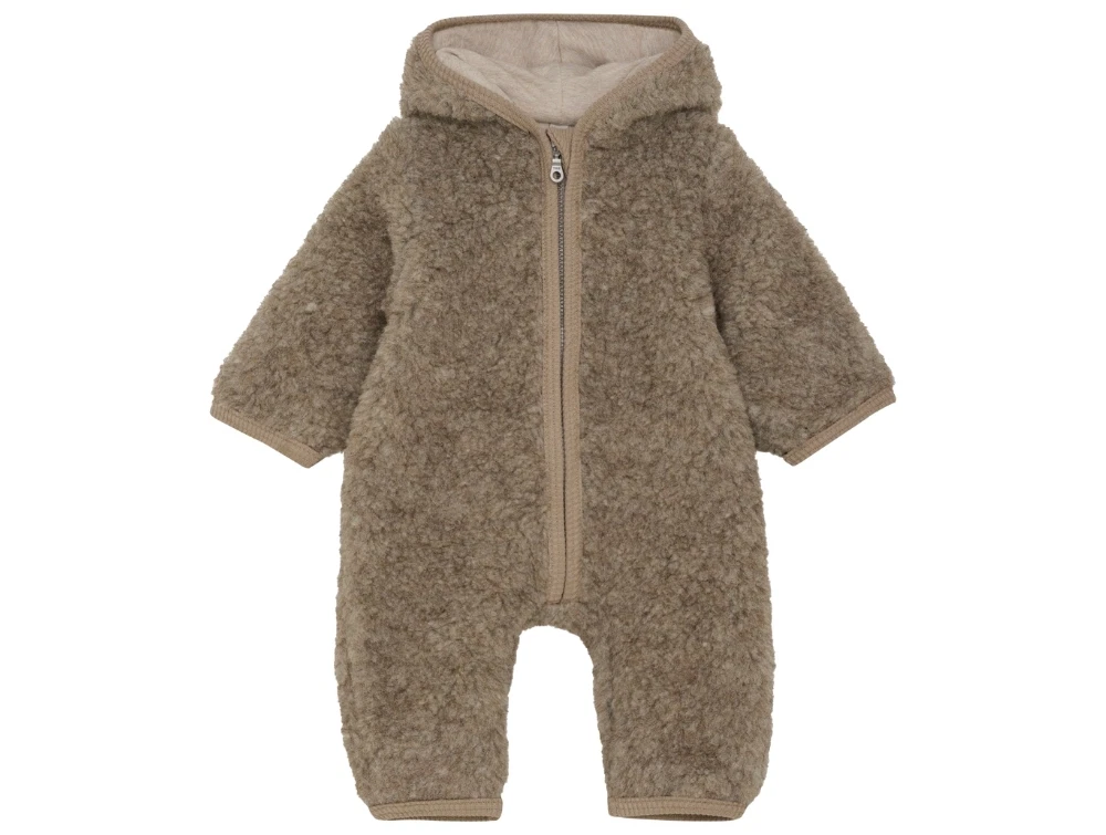 Køredragt i brun nuance fra Huttelihut. Dragten har et blødt teddy look og praktisk hætte.