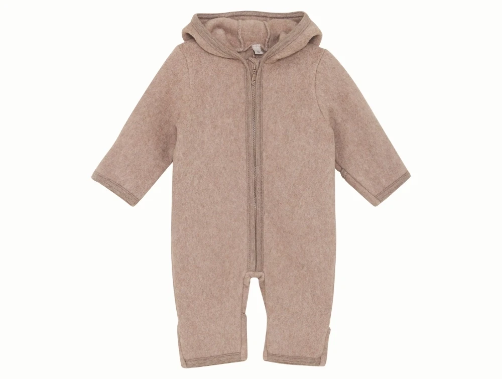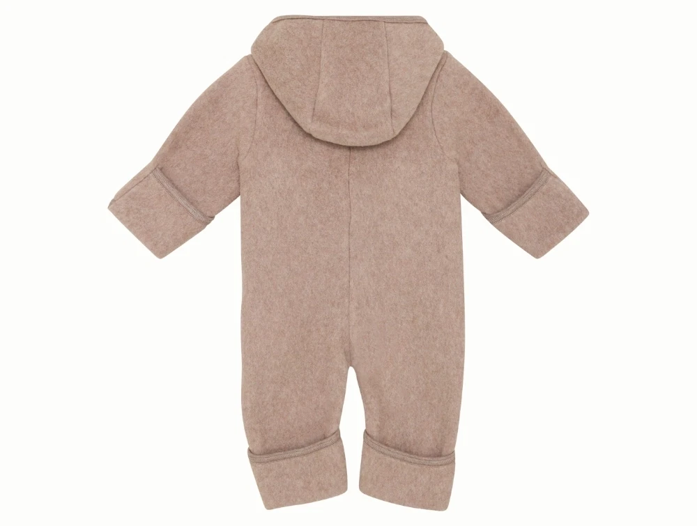 Dragten er fremstillet i 100% bomuldsfleece, som føles ekstra blød mod barnets hud. Den har hætte, lynlås foran med hagebeskytter samt ombuk ved hænder og fødder, som holder på varmen. En lun og behagelig dragt til de kølige dage.