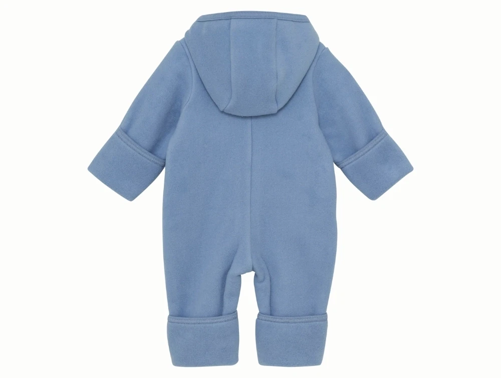 Dragten er lavet i 100% bomuldsfleece, som føles ekstra blød og behagelig mod huden. Den har hætte, lynlås foran med hagebeskytter samt ombuk ved hænder og fødder, så barnet holdes varmt. En ideel dragt til barnevognen eller de kølige dage i overgangssæsonen.