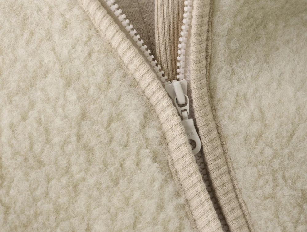 Designet har en gennemgående lynlås, som gør den let at få af og på, og pasformen giver god bevægelsesfrihed. Den bløde uld yder god varme uden at føles tung.