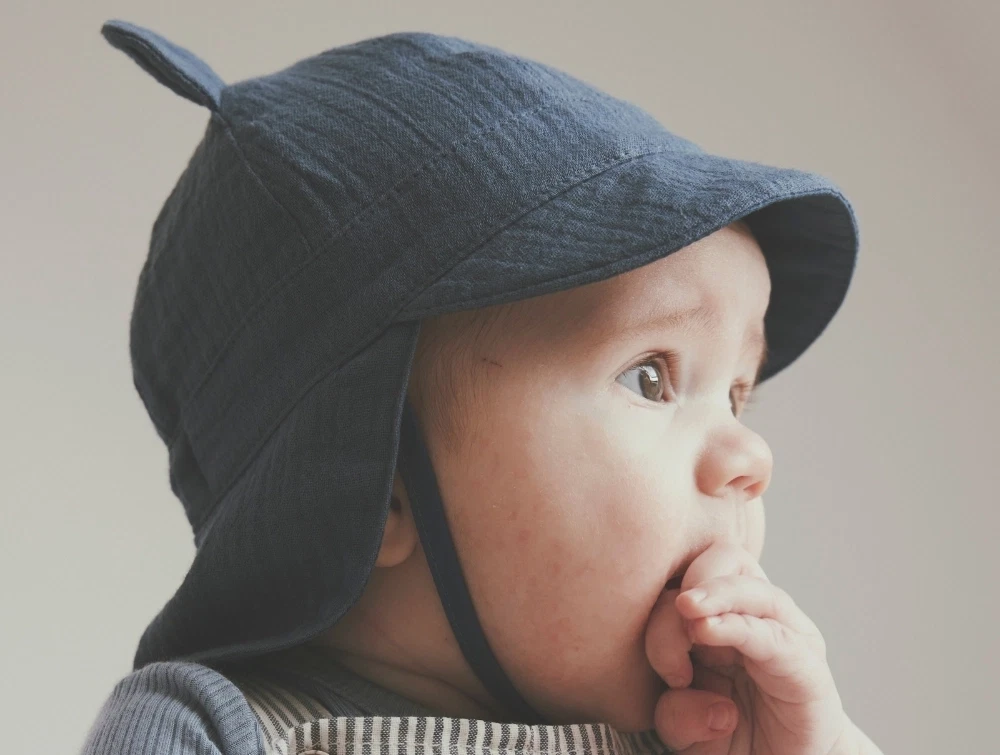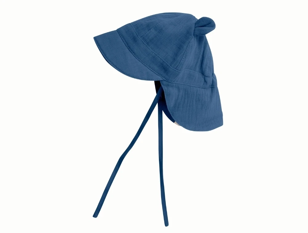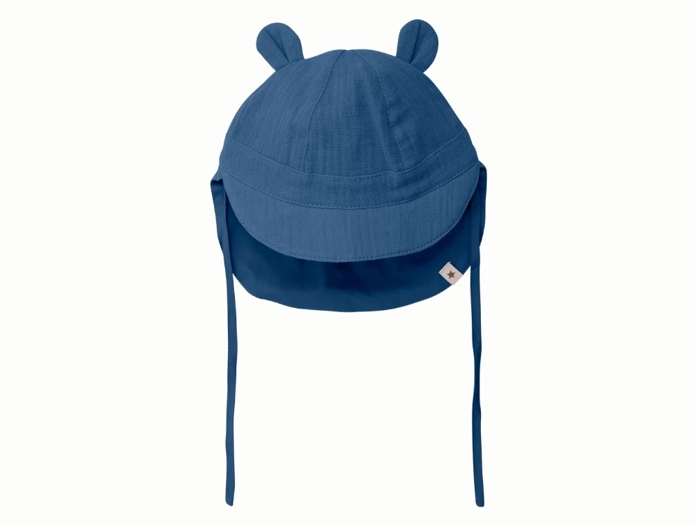 Hatten er fremstillet i 100% bomuldsmuslin, som føles let og luftig mod barnets hud. Den har små bjørneører på toppen, bindebånd i siderne og en solskærm foran samt forlænget nakke bagpå, der beskytter mod solen. En kær og praktisk hat til de varme dage.