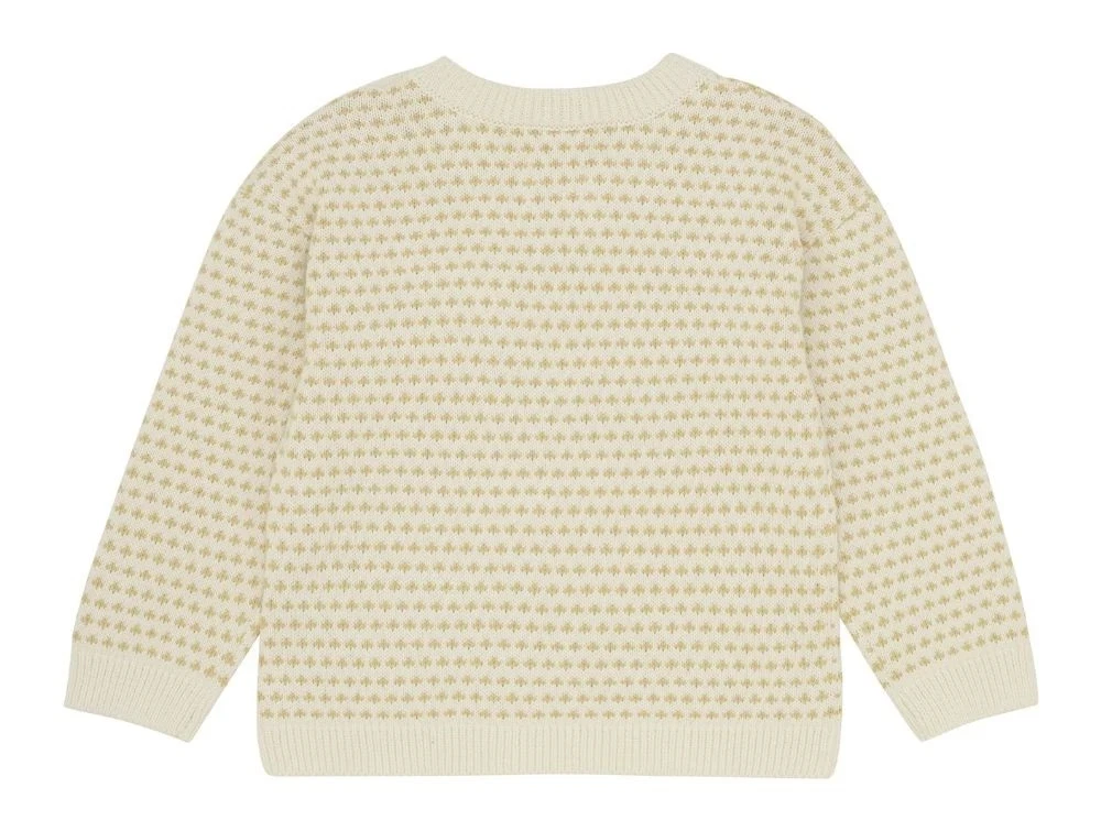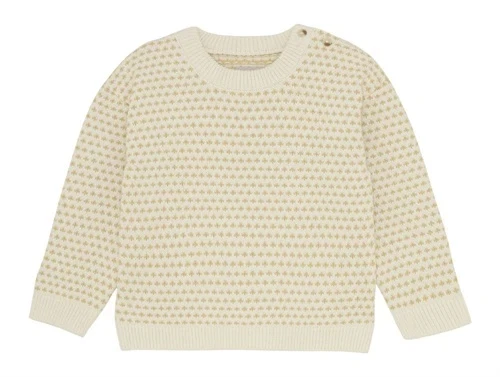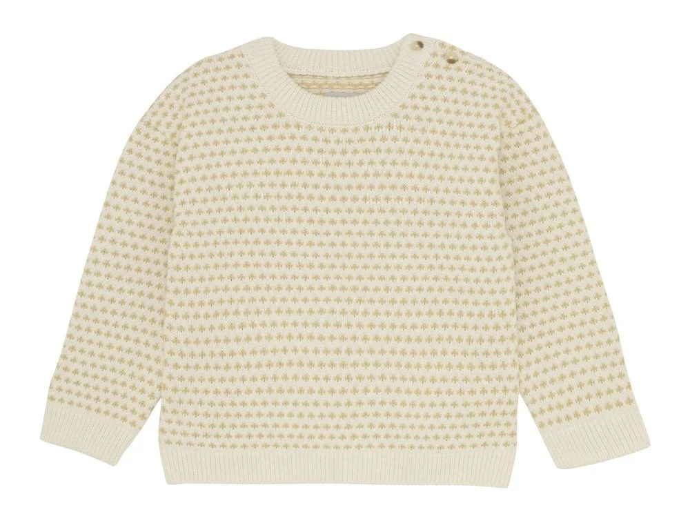 Striktrøje fra Huttelihut i en råhvid nuance med små sandfarvede mønstre over hele trøjen (moonstone). Trøjen har ribkanter og to knapper ved venstre skulder, så den er nem at tage af og på.