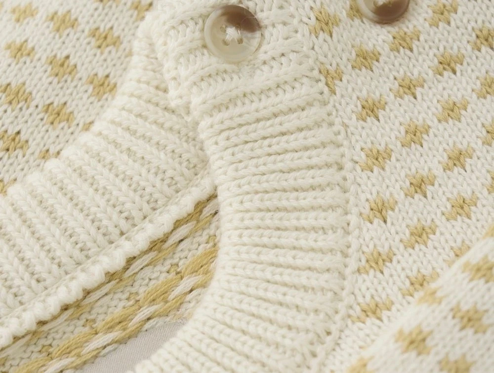huttelihut striktrøje i naturhvid med sandfarvet mønster og knaplukning ved halsenbagside af huttelihut striktrøje i bomuld med mønsternærbillede af rib og knapper på huttelihut strik i sandfarvet mønster