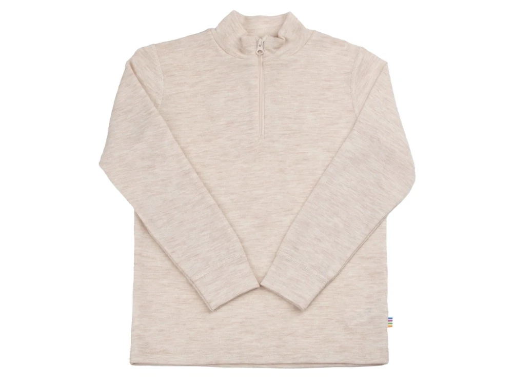 Uldens naturlige egenskaber gør blusen temperaturregulerende og åndbar, så barnet holdes varmt i koldt vejr og køligt på varmere dage. Det melerede stof giver et enkelt udtryk.