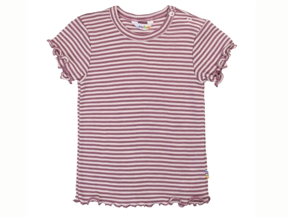 Joha t-shirten i lilla strib med flæsekant og korte ærmer