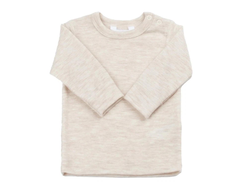 Blusen er designet med trykknapper på venstre skulder i de mindste størrelser (60-90 cm), som gør det lettere at tage den af og på. Den enkle stil og melerede struktur giver et tidløst udtryk.