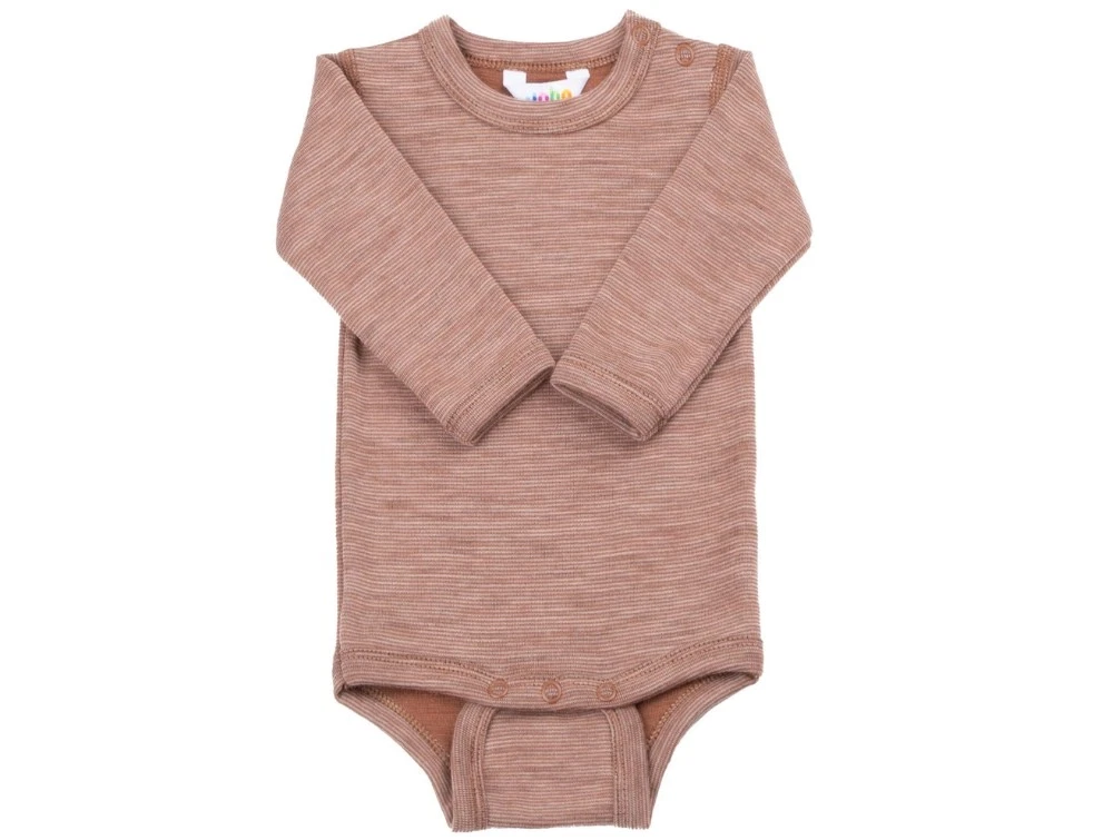 Uldens naturlige egenskaber gør bodyen temperaturregulerende og åndbar, så barnet holdes varmt i koldt vejr og køligt på varmere dage. Det smalle stribemønster giver et enkelt og fint udtryk.