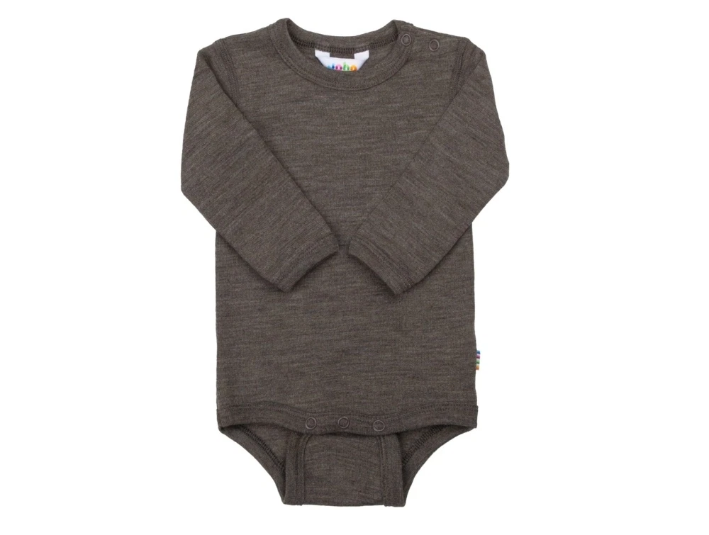 Jeg synes, at Johas bodyer i uld/silke er noget af det mest anvendelige basistøj til baby. Denne model i brun melange er tynd og blød og kan bruges hele året. På kolde dage er den perfekt som inderste lag under en cardigan eller trøje.